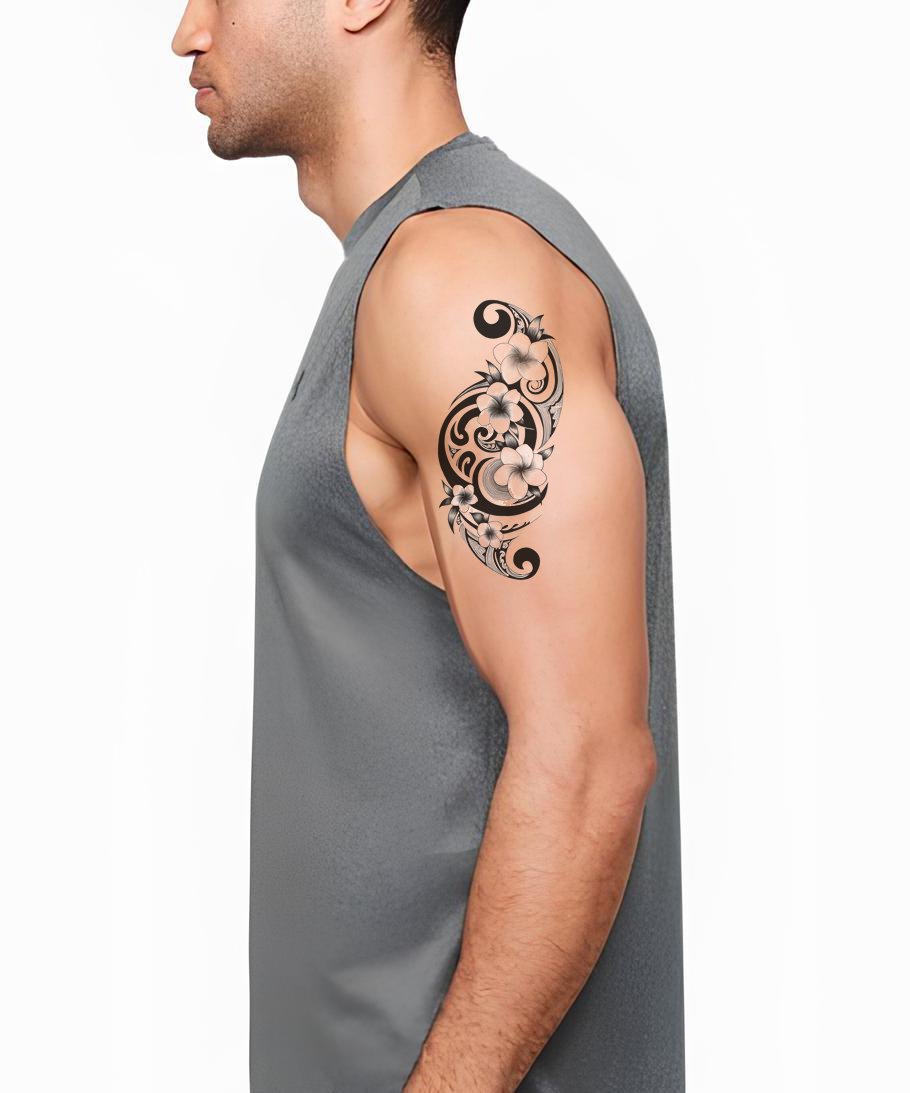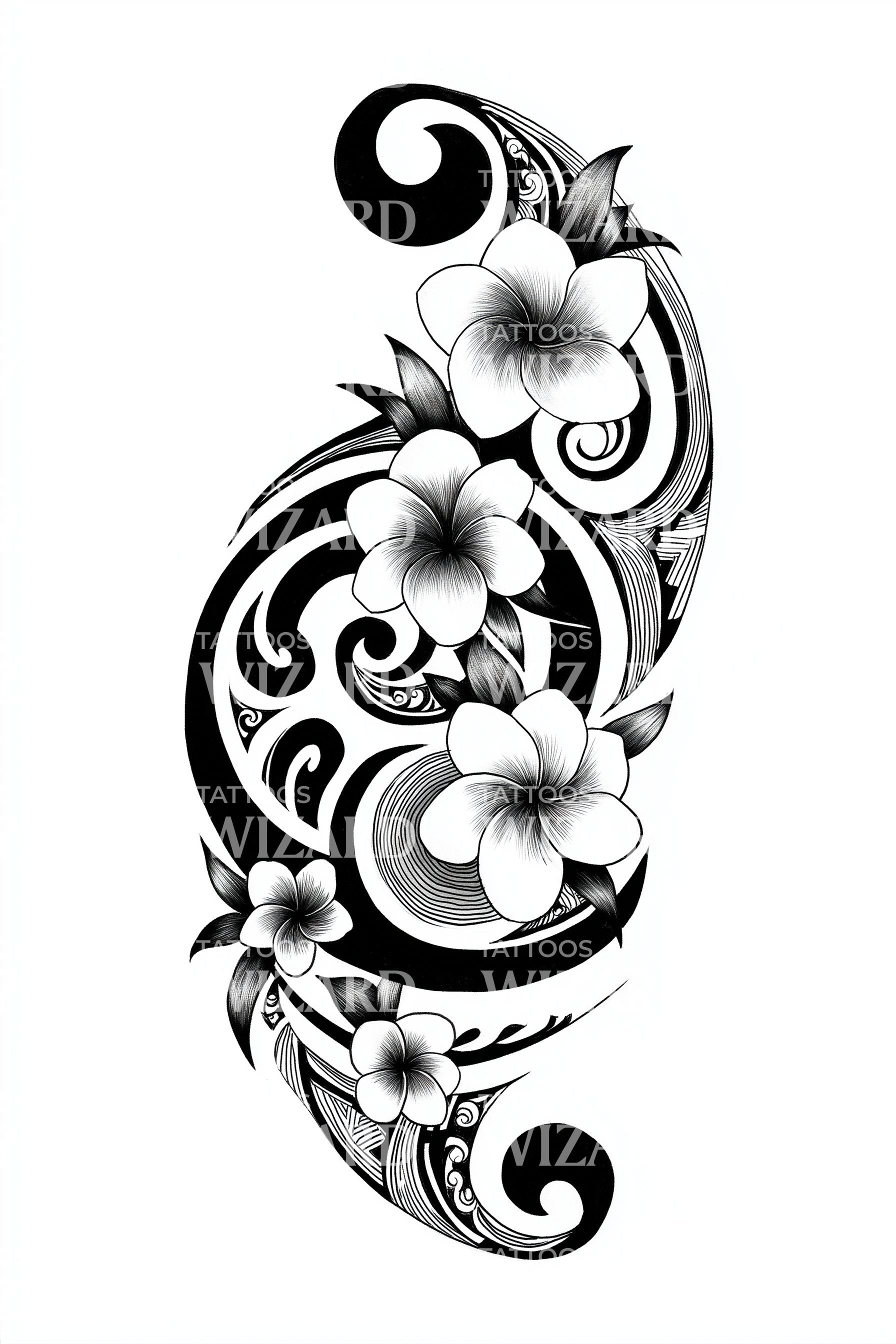 沉浸于黑工艺术的世界,这款大胆而强烈的纹身设计散发出无可否认的艺术气息。作品巧妙融合鸡蛋花与旋涡元素,打造出视觉震撼的花卉盛景。这件黑工作品真正体现了独特迷人的美学。