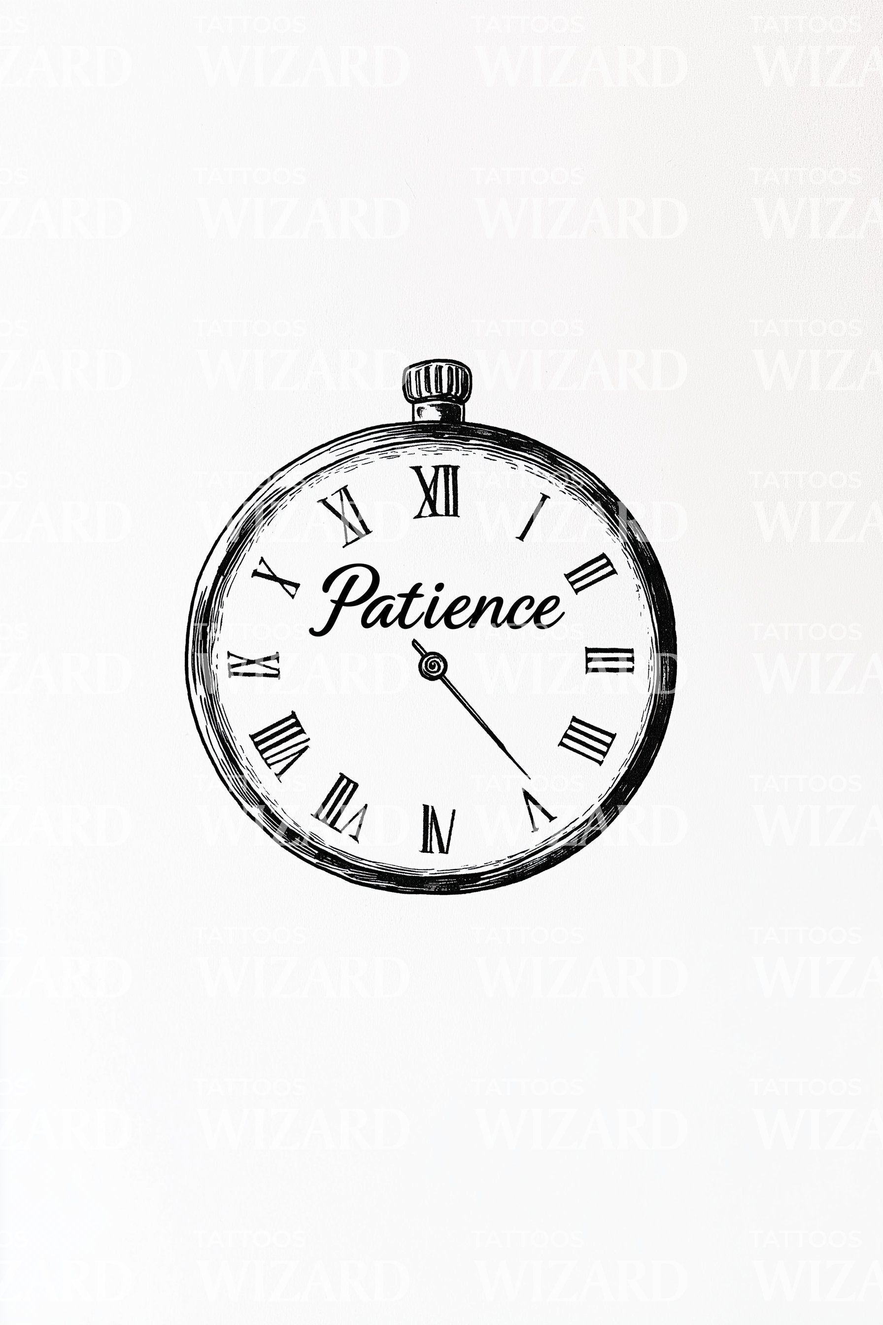 Vintage pocket watch in delicate microrealism, crisp Roman numerals circling script Patience. Still hands honor time’s quiet lessons, a reminder to breathe, wait, and trust unfolding. Wearer feels steady, grounded, intentional. Ideal placements: inner forearm for visibility, wrist for intimacy, chest for heartward meaning, upper arm for balanced framing.