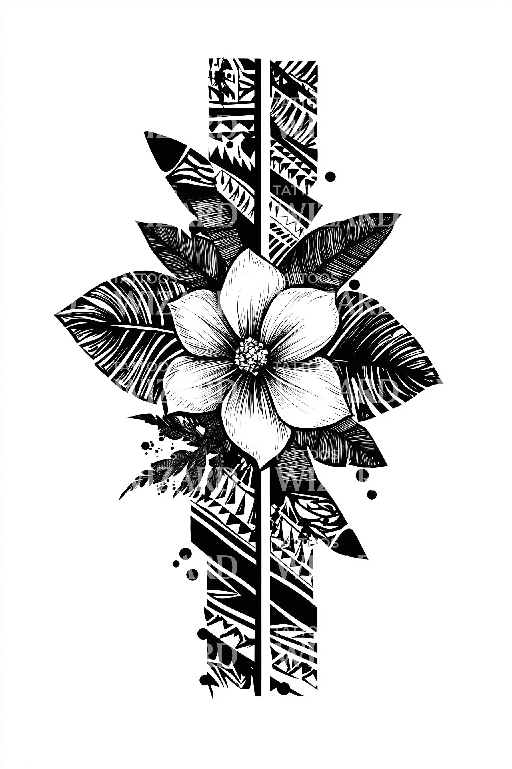 沉浸于波利尼西亚异域之美,这款部落纹身设计巧妙融合了图腾的力量、花朵的优雅与纹带的连续性,编织成一幅迷人的图案。完美体现部落精神与象征,为您的风格增添独特韵味。
