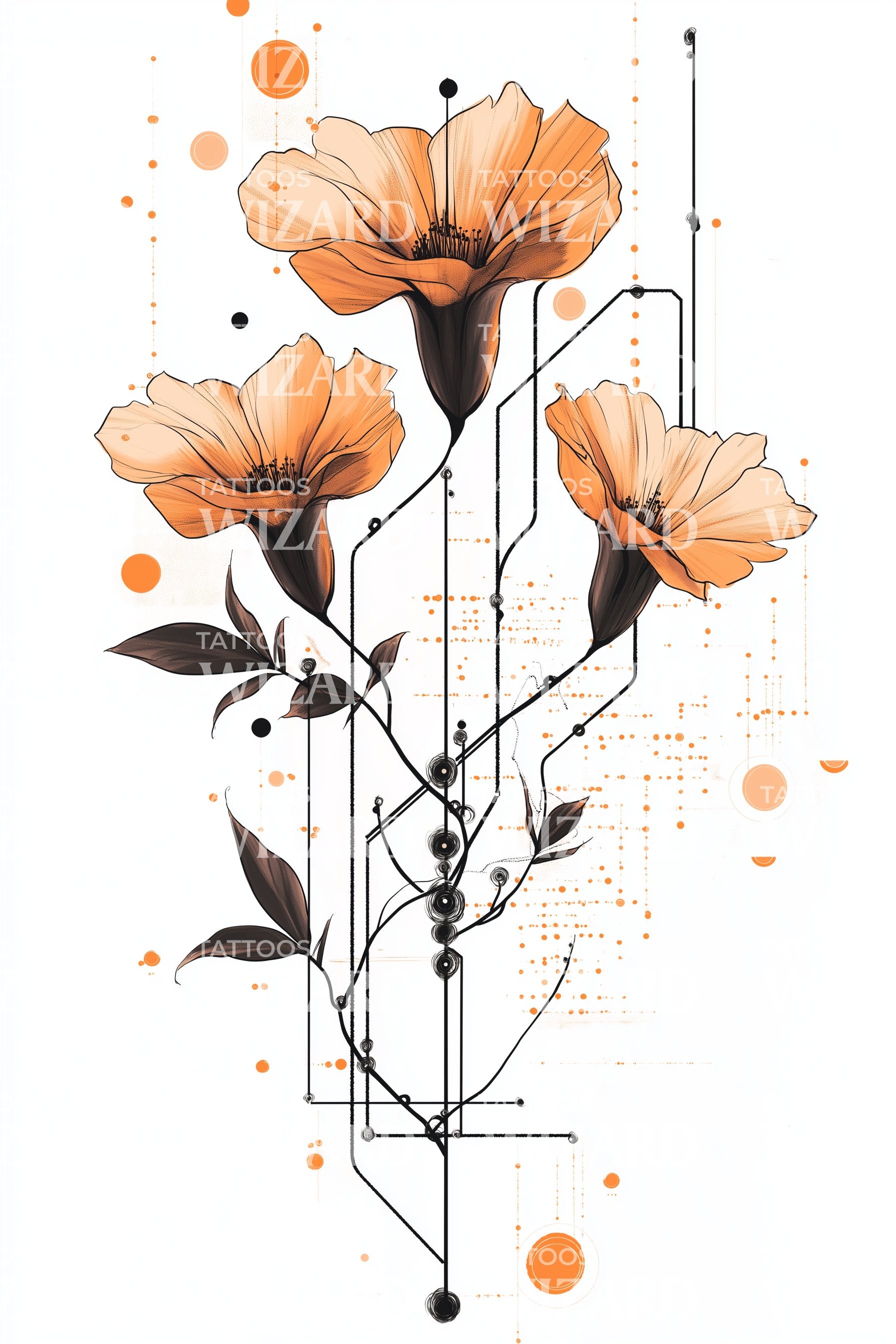 这款水彩纹身设计散发出生动的橙色色调,完美捕捉了植物罂粟花的精髓。置于引人入胜的网格布局中,创意与自然精神的融合迸发出生命力,呈现出对激情与渴望的生动艺术表达。