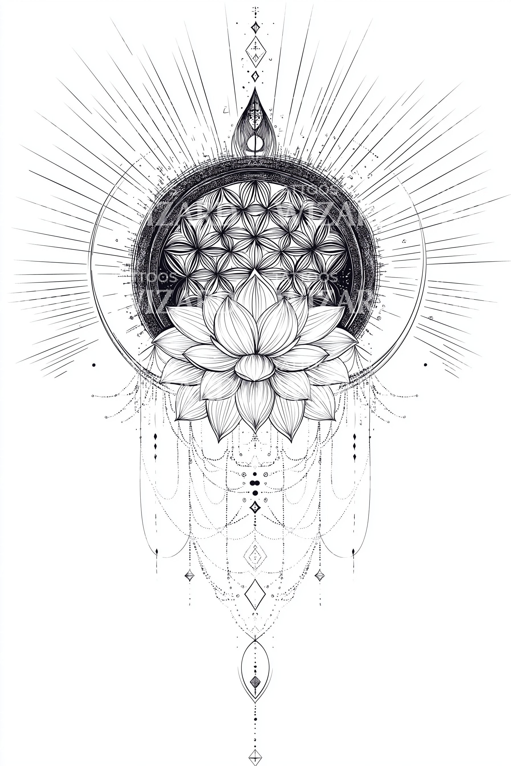 沉浸于神圣几何的对称之美,这款装饰性纹身设计以神秘的莲花和拱门主题,成为通往神圣智慧的门户。每一个精细的细节,这件富有戏剧性和象征意义的艺术作品,都将以其灵性魅力提升您的纹身收藏。
