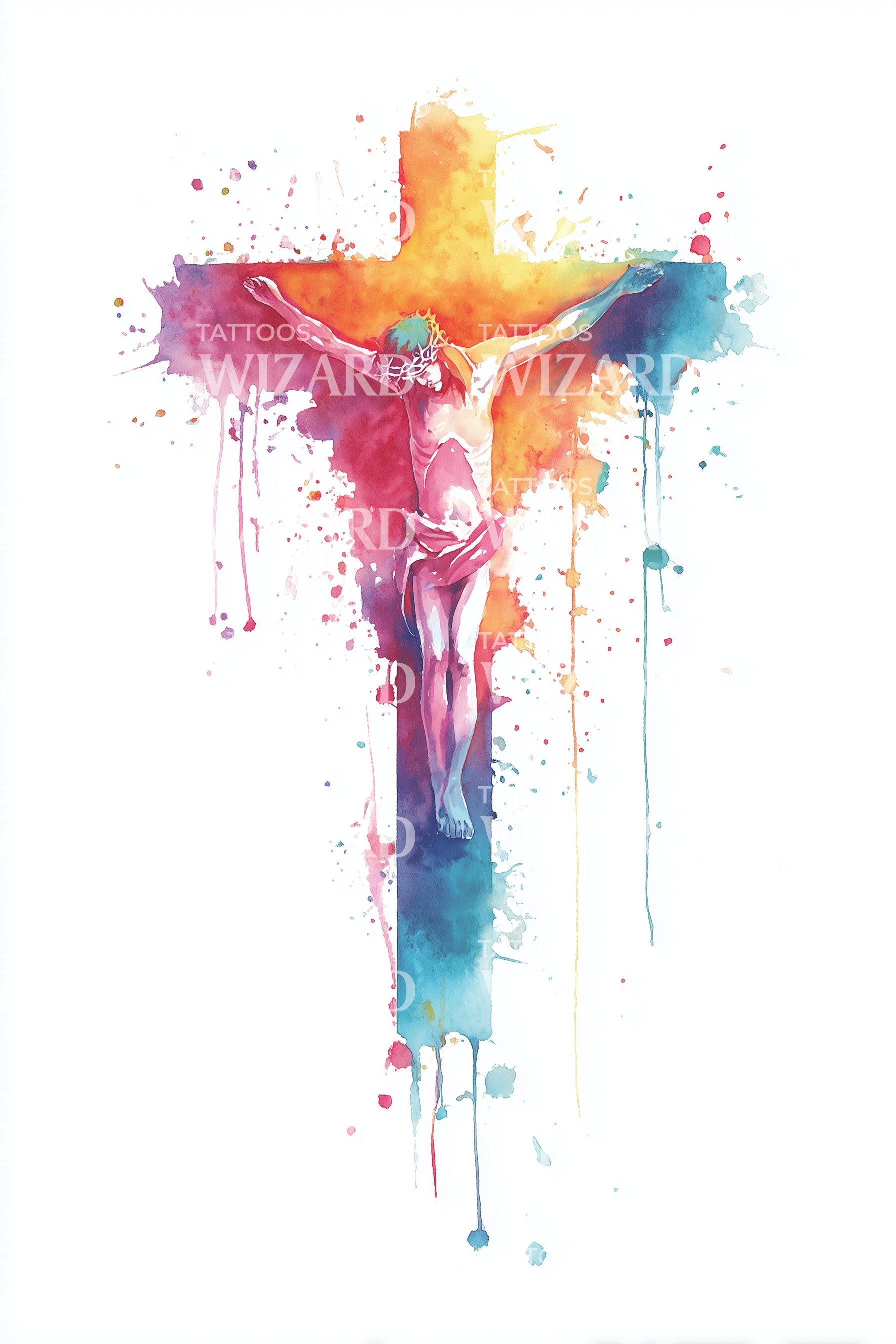 以这款生动的水彩纹身设计拥抱你的信仰,巧妙地融合了美丽的色彩棱镜。十字架象征着光明与希望,位于中央,绽放出万花筒般的光辉。这款纹身设计不仅是你信念的见证,更是对色彩与生命的赞美!
