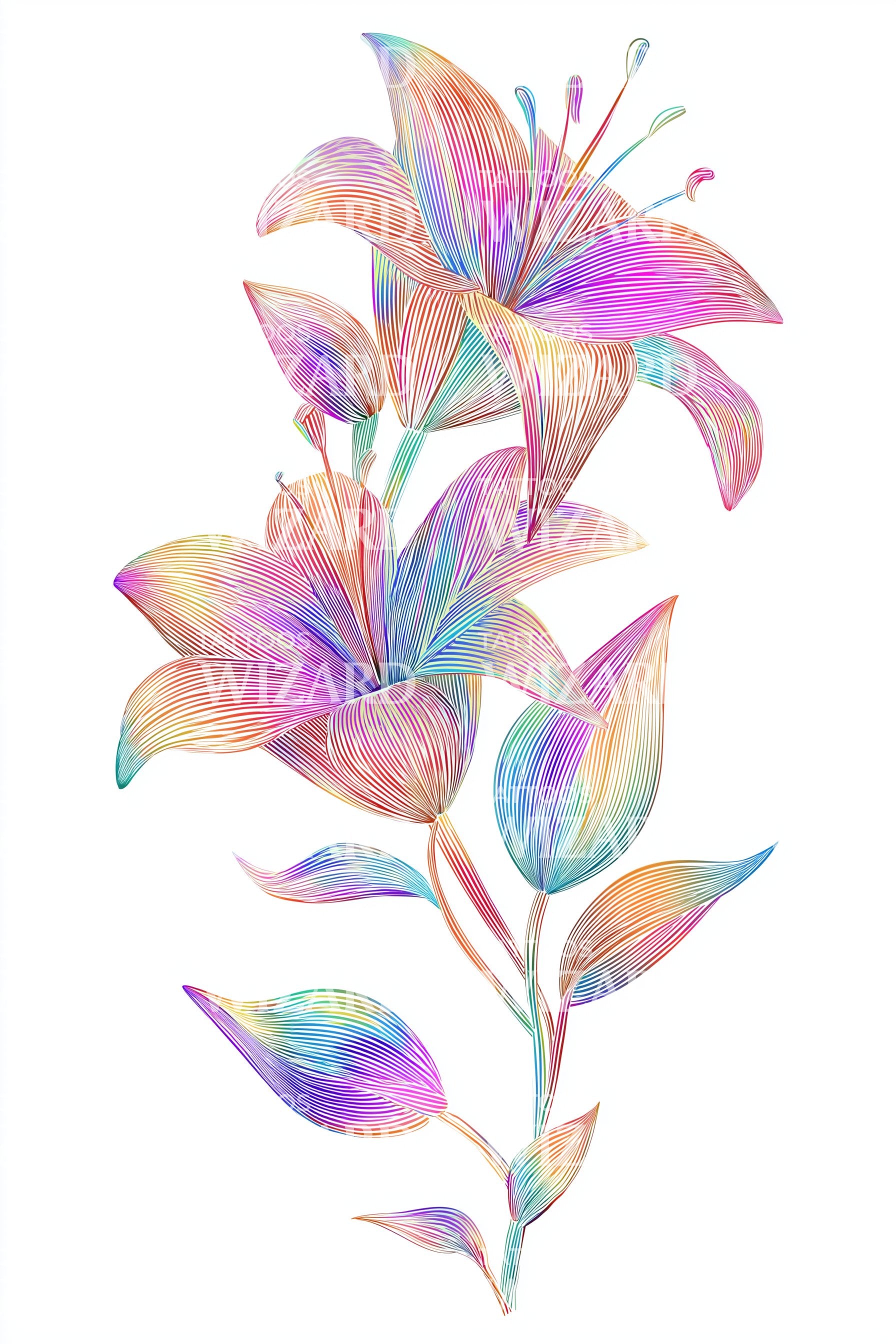 沉浸于大胆色彩与独特艺术的融合,体验我们的水彩彩虹百合纹身设计。这是一场充满迷幻色彩的生动交响,凝聚了花卉的精髓。这个色彩丰富、细腻复杂的设计,为您提供了一种以新颖创意表达装饰肌肤的独特方式。
