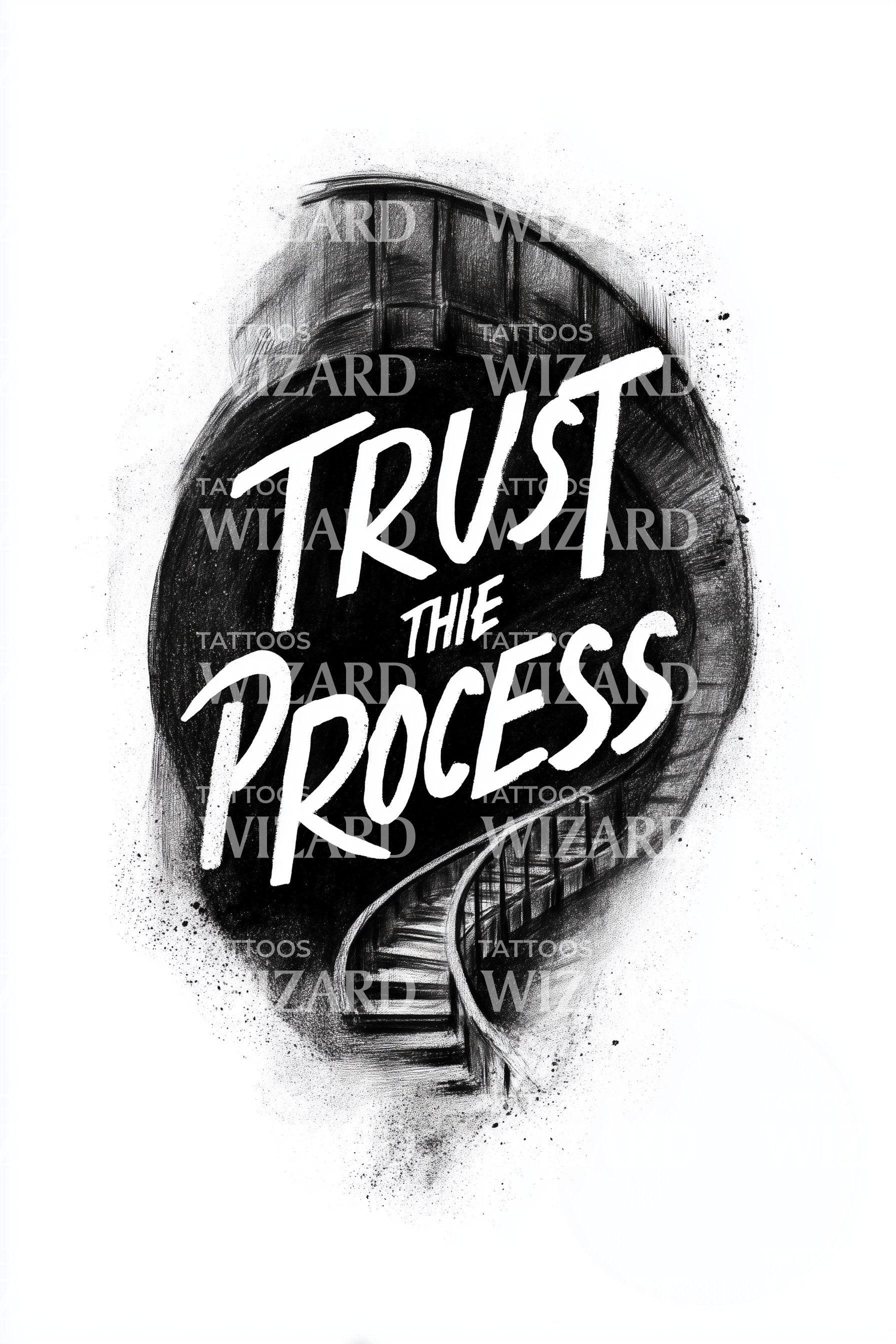 Charcoal-sketch aesthetic frames a bold brush-calligraphy quote, Trust the Process, sitting inside a shadowed vortex while a spiraling staircase climbs upward. The imagery honors growth through steady steps, each rung a lesson. Wearing it feels like momentum and faith, a personal reminder to choose patience, motivation, and trust.