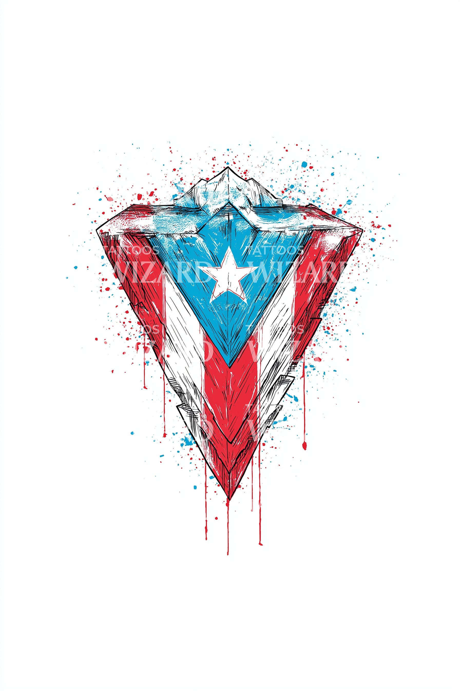 用水彩盾牌庆祝波多黎各,绽放出岛屿的色彩。大胆的蓝色三角形承载着标志性的白色星星,周围是流动的旗帜条纹,融化成画笔般的滴落。柔和的晕染与清晰的几何形状相遇,创造出一个充满活力的保护徽章——集自豪、坚韧、现代艺术与传统于一体。