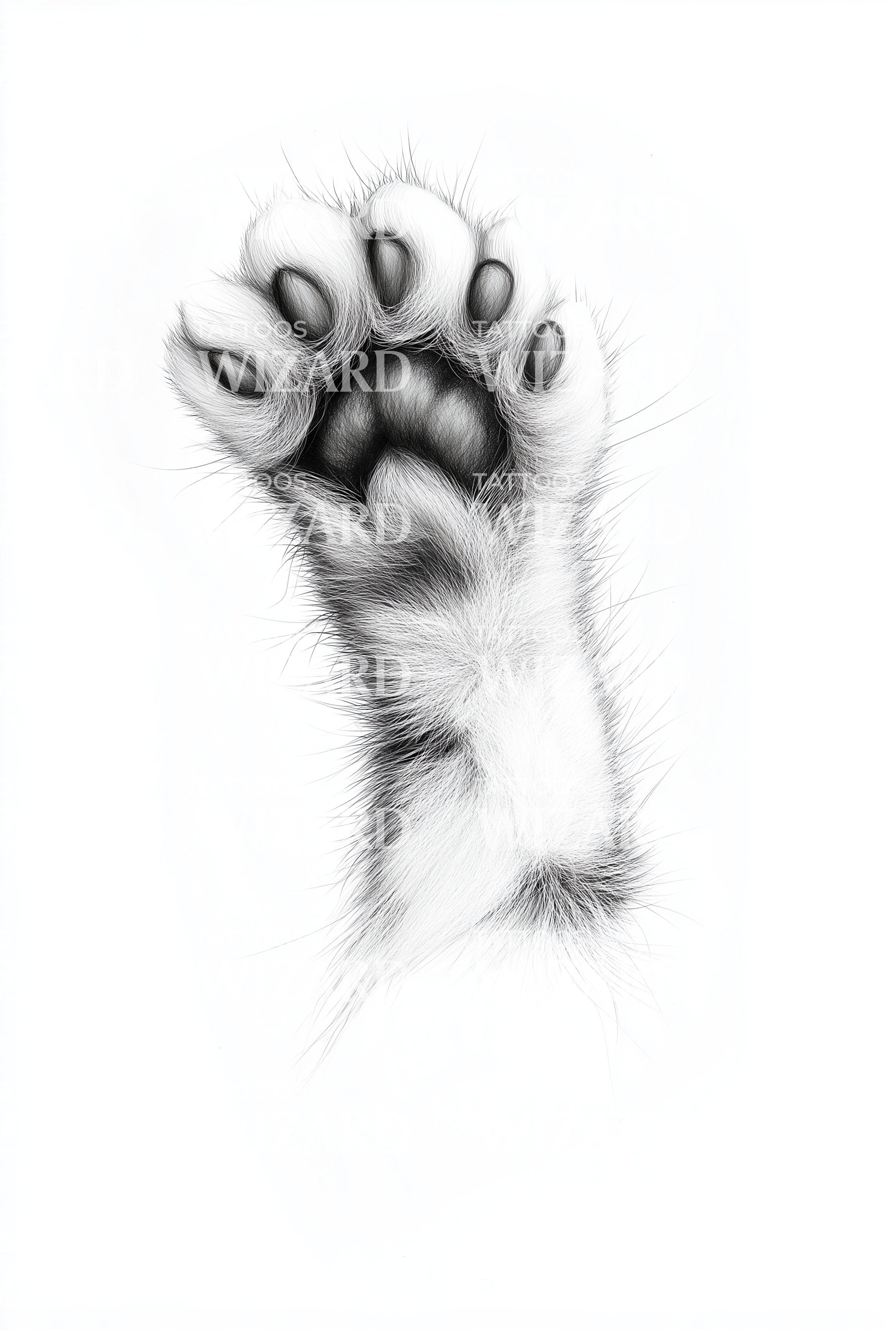 Fineline realism renders a lifted puppy paw in whispered greys, each soft pad and feathery hair floating like a gentle print on air, undeniably cute. Symbol of loyalty, play, and home, it honors a beloved pet. Wearing it feels tender, hopeful, and quietly brave, like tiny steps beside you.