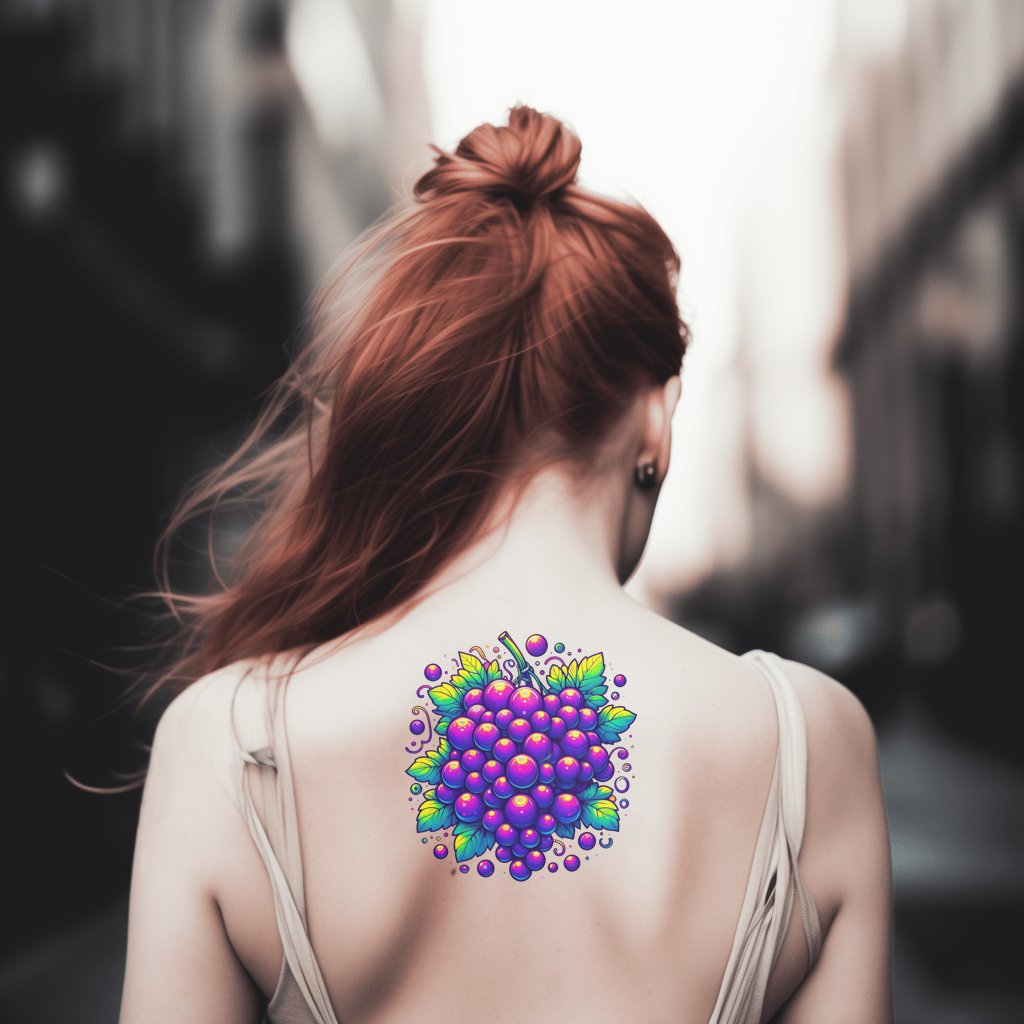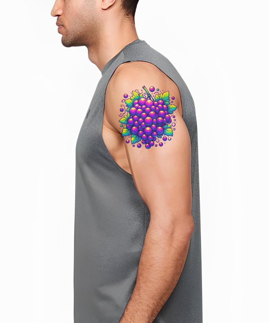 这款插图纹身设计以生动的色彩为特色,散发出紫葡萄的新鲜魅力。每个水果元素都精致地绘制,展示了自然的固有魅力,装饰性极强。对于那些拥有活泼和丰盈个性的人来说,这是一款完美的设计。