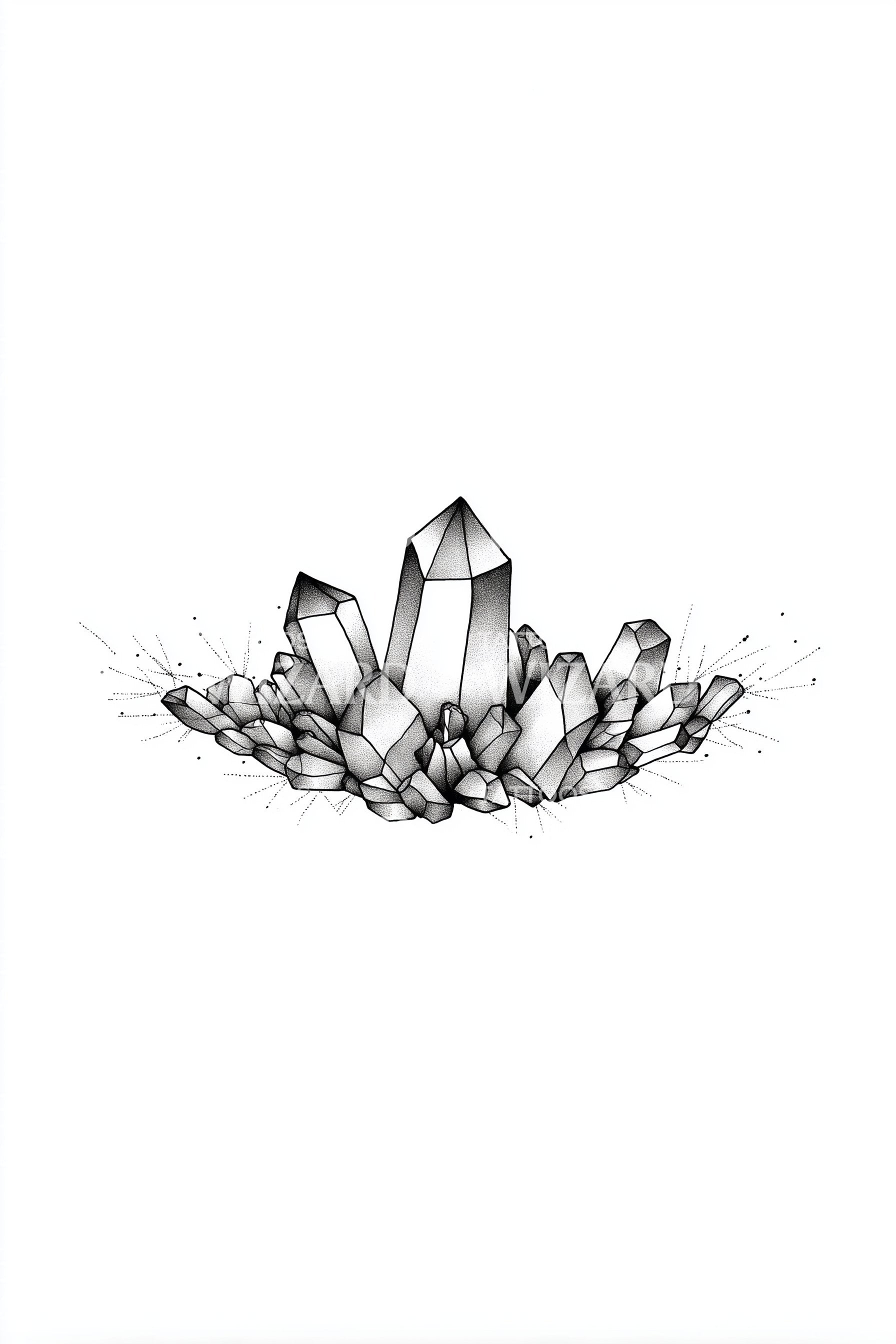 Blackwork quartz cluster rises in crisp facets, stippled shadows and radiant dotbursts. Mineral geometry gathers like a small altar, a crystal chorus that amplifies energy and clears static. Symbol of clarity, focus, and grounded purity. Wearing it feels steady and luminous, a personal compass cut from earth.