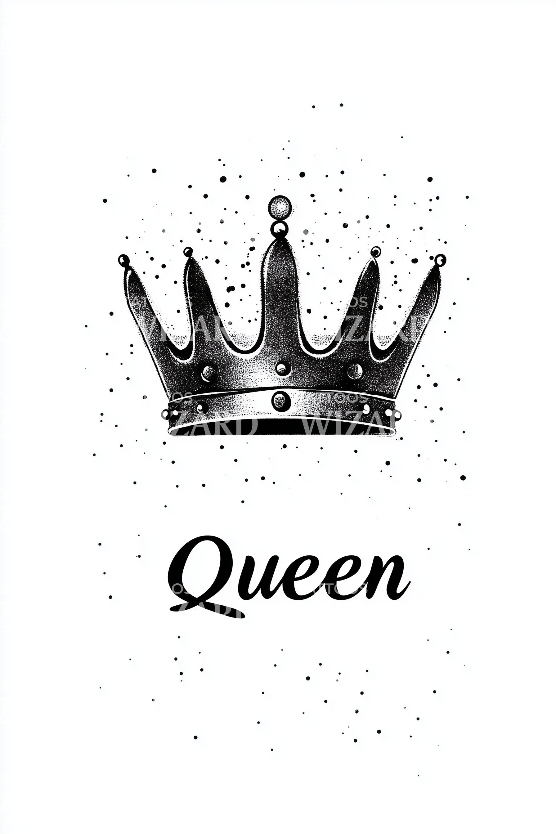 Sovereign minimalism in black ink: a classic crown rendered with soft dotwork and airy speckles, above elegant “Queen” lettering. Symbol of lineage, dignity, and self-rule, it honors inner royalty. Wearing it feels poised and grounded, a quiet reminder to lead with grace, resilience, and timeless style.