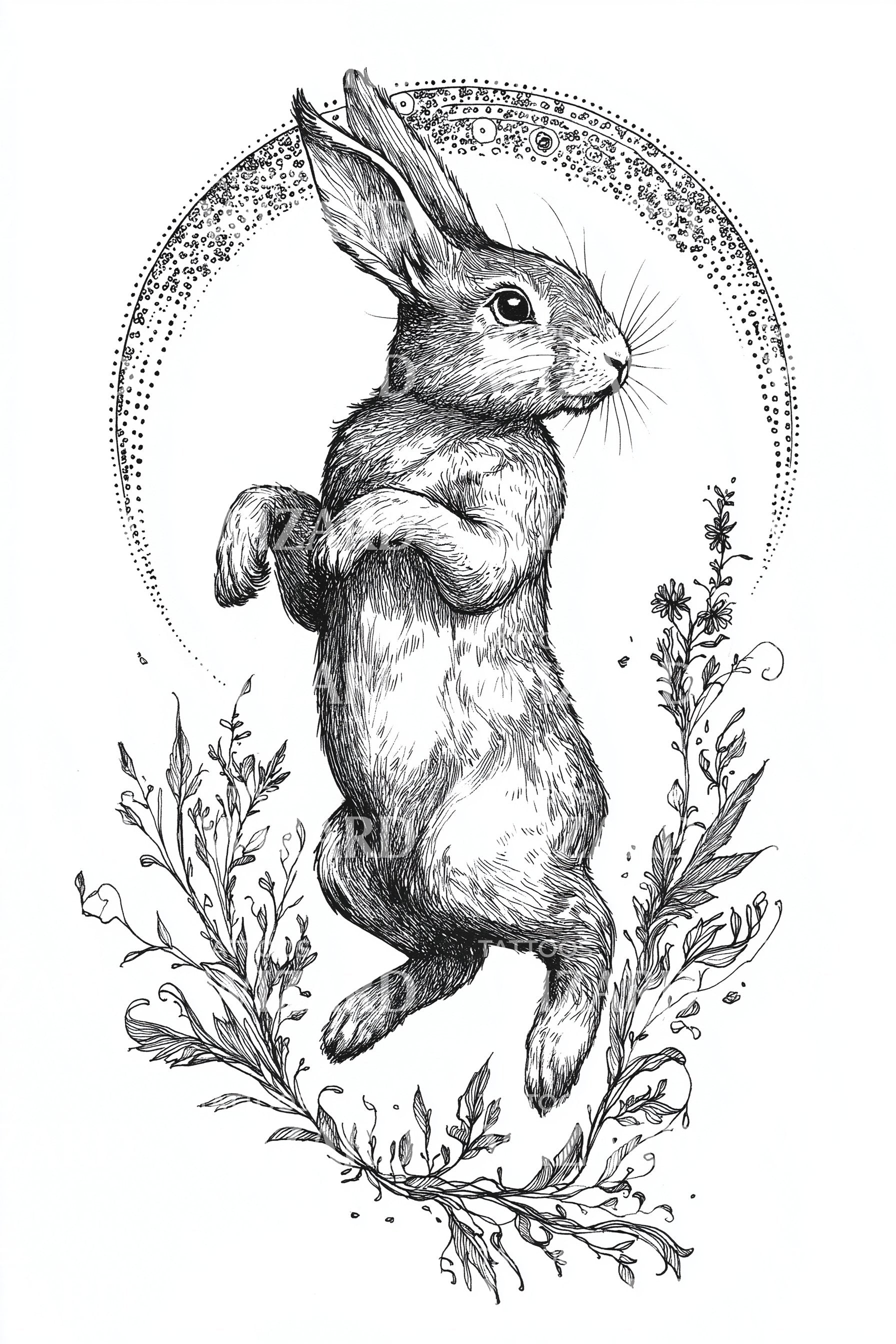 A rabbit, not to soften you, but to remind you how bravery can be gentle. Botanical wreath and nature’s hush cradle the instinct to leap anyway. Drawn to the ones who stay tender without staying small. In dotwork: “quiet heart, quickening feet.”