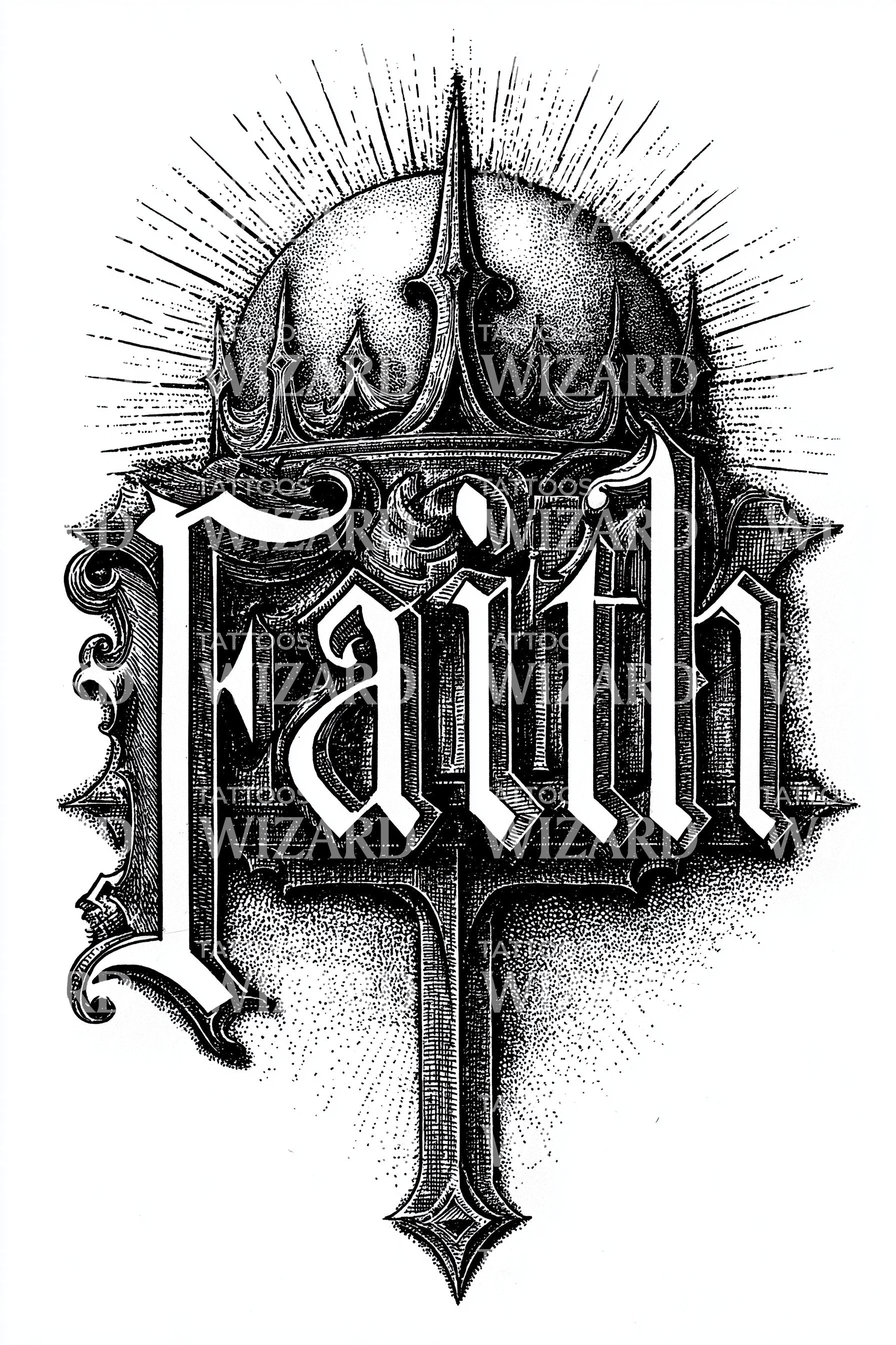 Gothic black&grey script reads Faith, framed by filigree, a radiant halo-crown, and a cross stem rendered in stippled light. Symbolism speaks of devotion, guidance, and protection through every trial. Wearing it feels grounded yet spiritually uplifted. Ideal on sternum, forearm, calf, or upper back, where vertical flow and rays breathe.
