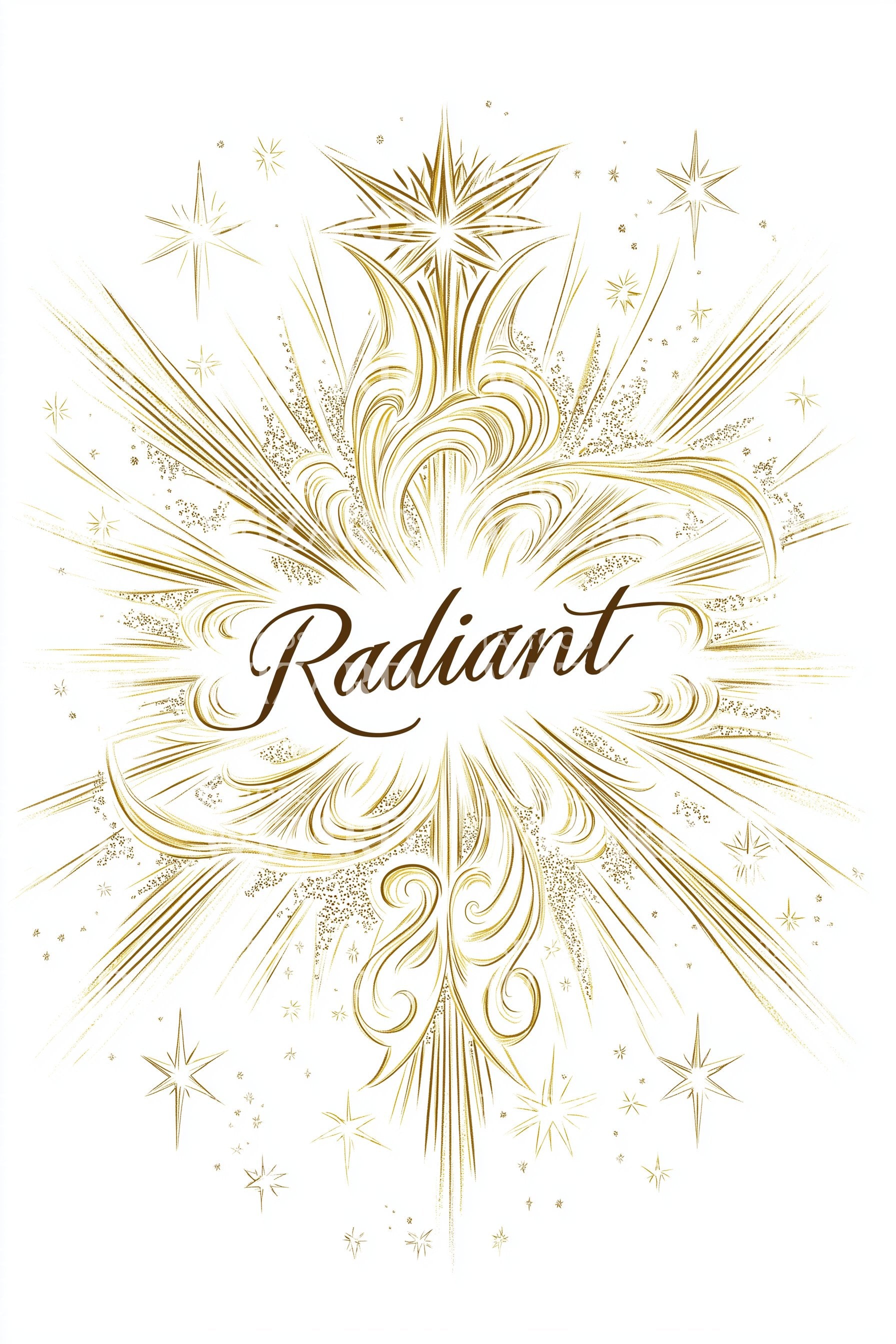 Gilded filigree blooms into a celestial starburst, script reading Radiant cradled by floral swirls and constellations of glittering points. Gold lines symbolize a heart unfurling, guidance, and self-worth shining outward. Wearing it feels luxurious and uplifting, like warm light on skin, crowning courage with radiant grace and glamour.