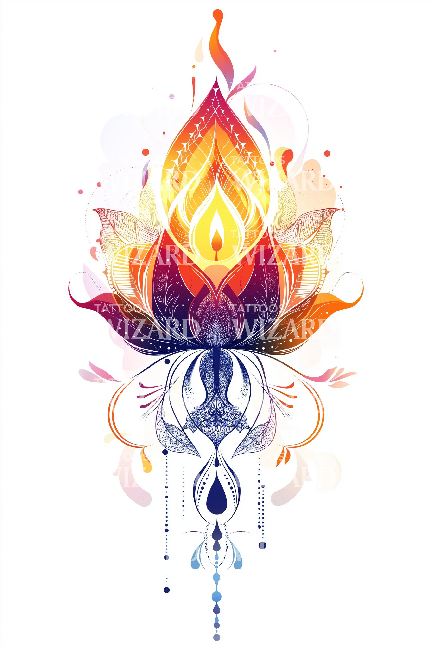 用这款引人注目的水彩纹身设计点燃你的灵魂。火焰的鲜艳能量与莲花的细腻美感相融合,创造出一幅散发色彩与正能量的艺术作品。完美象征坚韧、蜕变与焕发的新力量,以多彩风格展现。