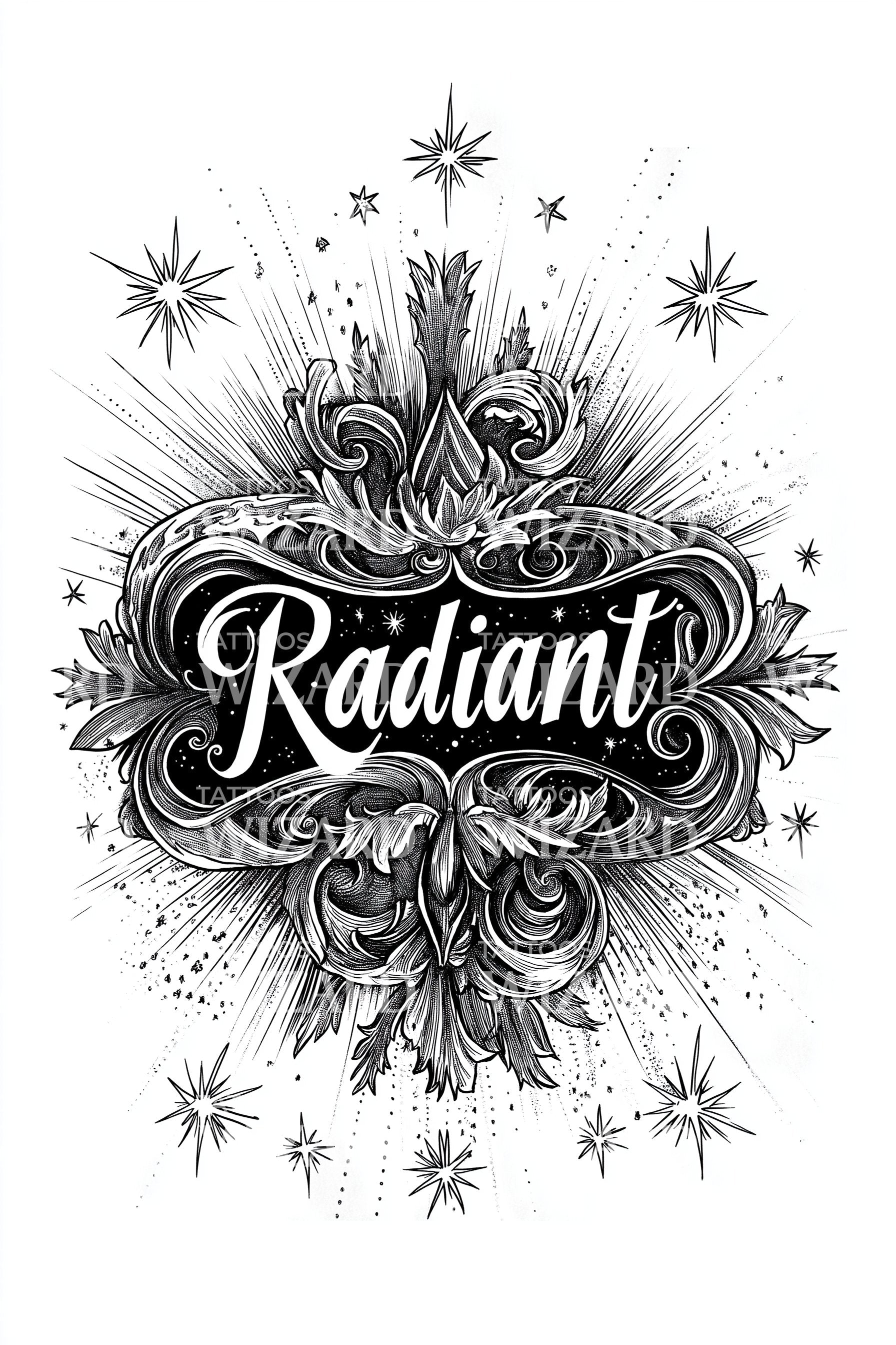 Baroque scrolls bloom into a luxe floral frame, cradling a star-swept midnight where Radiant glows in elegant script. Ornamental leaves suggest growth and resilience; starlight honors inner guidance. Wearing it feels gilded and luminous, like carrying your own aurora, courage crowned by beauty and timeless poise, every day.