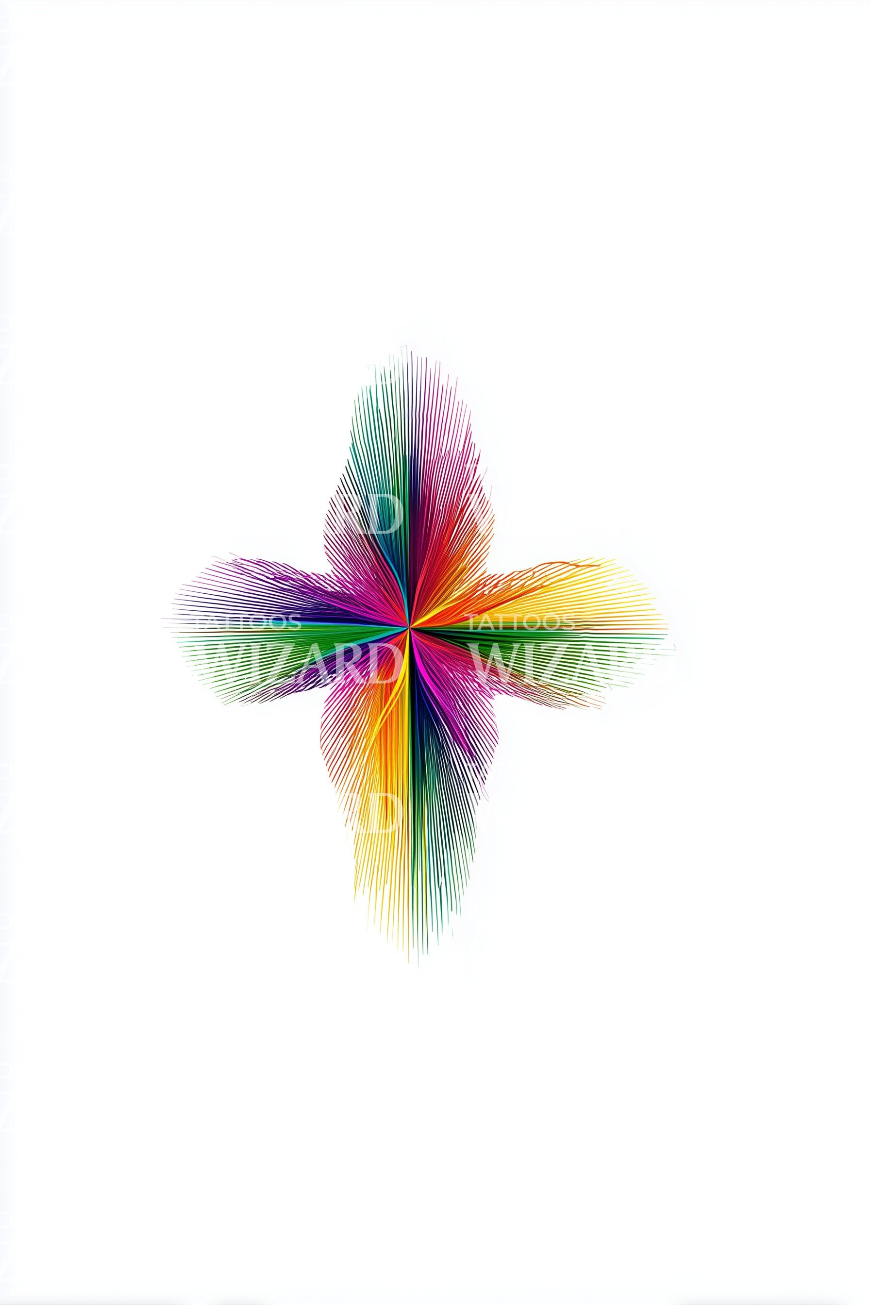 用这款水彩纹身设计以绚丽的色彩点亮你的信仰。它展现了一个充满活力的十字架、耀眼的彩虹和象征希望、宁静与幸运的幸运草。这幅生动多彩的作品非常适合那些喜欢以现代而明亮的方式表达自己灵性的人。
