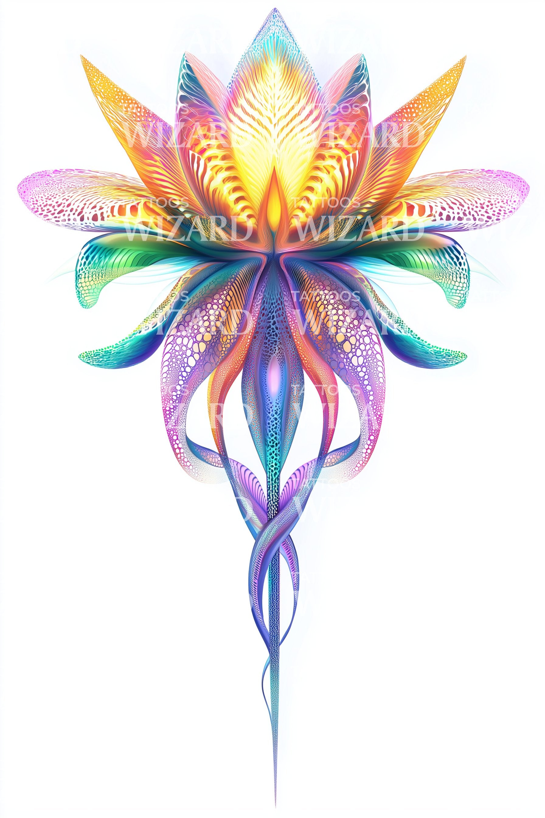 用这款水彩莲花纹身让你的肌肤沐浴在色彩的瀑布中。沉醉于其迷人的彩虹色调,回响着你充满活力的脉轮。散发能量,这种精神象征与鲜艳美学的完美融合,将为你的纹身收藏增添难忘的魅力。