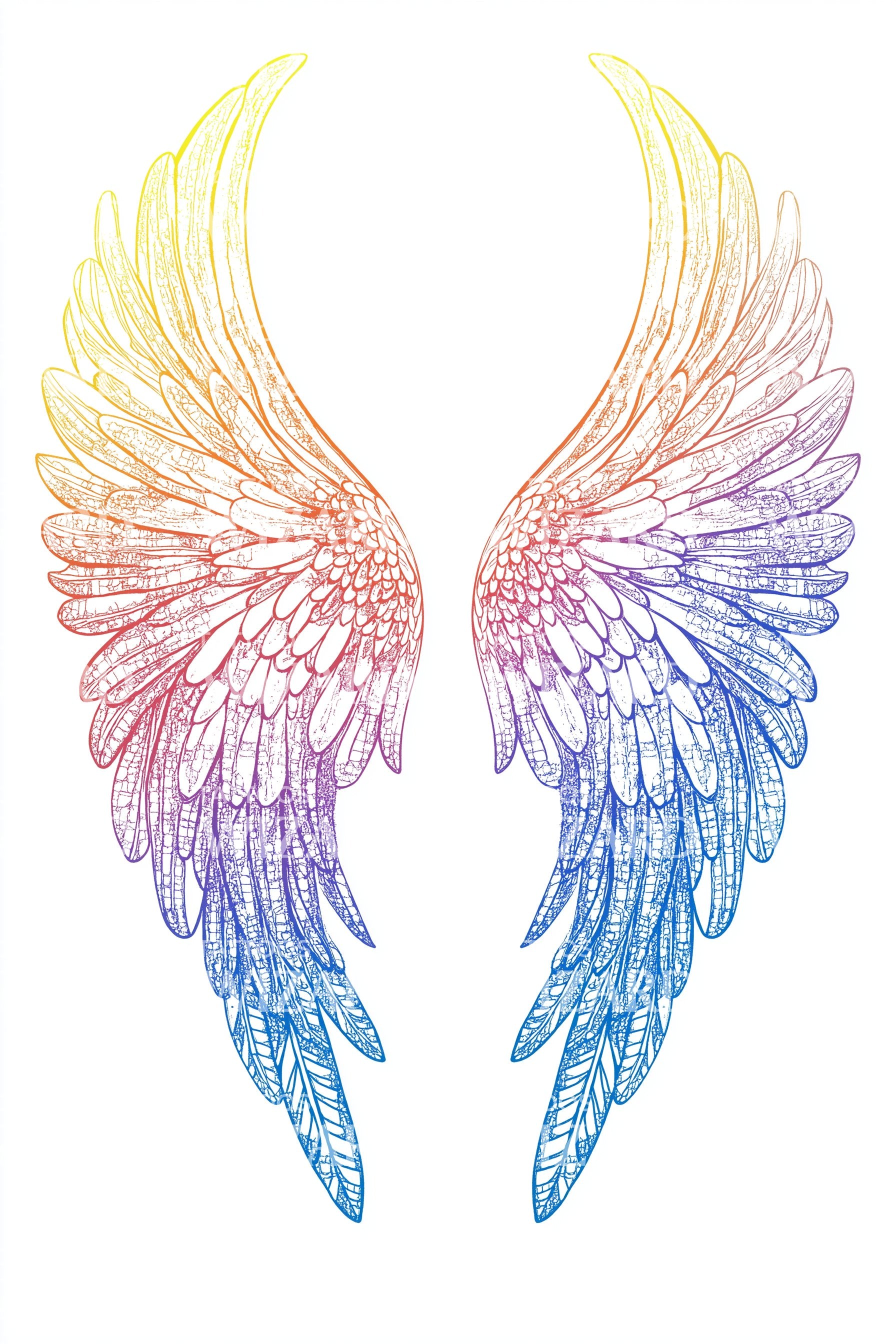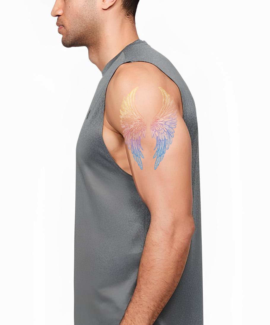 这款水彩纹身设计融合了天使翅膀的优雅与彩虹的空灵之美。它完美地体现了希望、飞翔和天使光环的感觉,不仅仅是身体艺术——它是一种空灵的坚韧与自由的表达,带来一抹鲜艳的色彩。