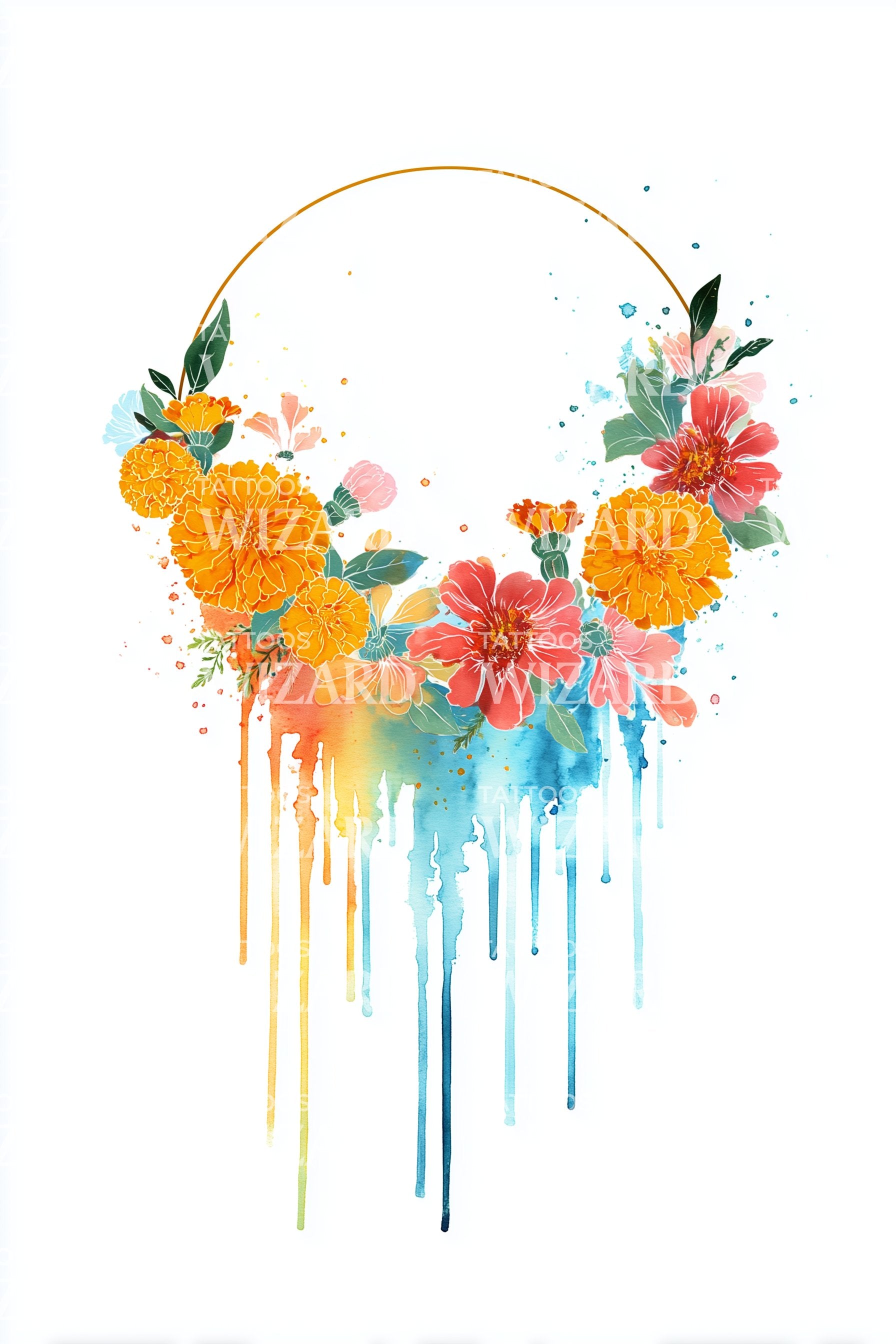 用这款充满活力的水彩纹身设计为你的肌肤增添一抹色彩。它以精美的彩虹色花环为特色,散发出叛逆的滴落效果。其圆形设计增添了完美的对称感,使其既奇幻多彩,又引人注目。