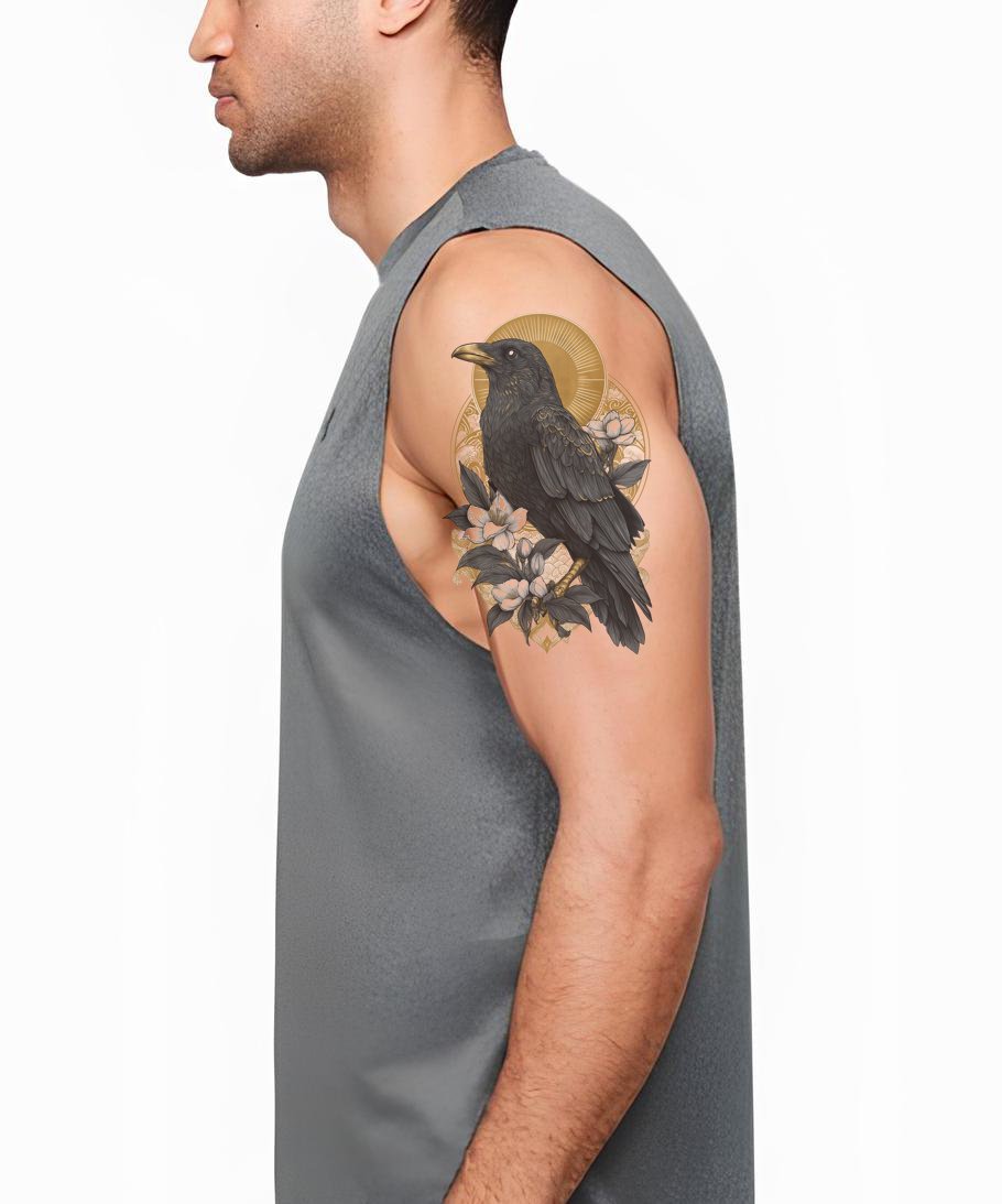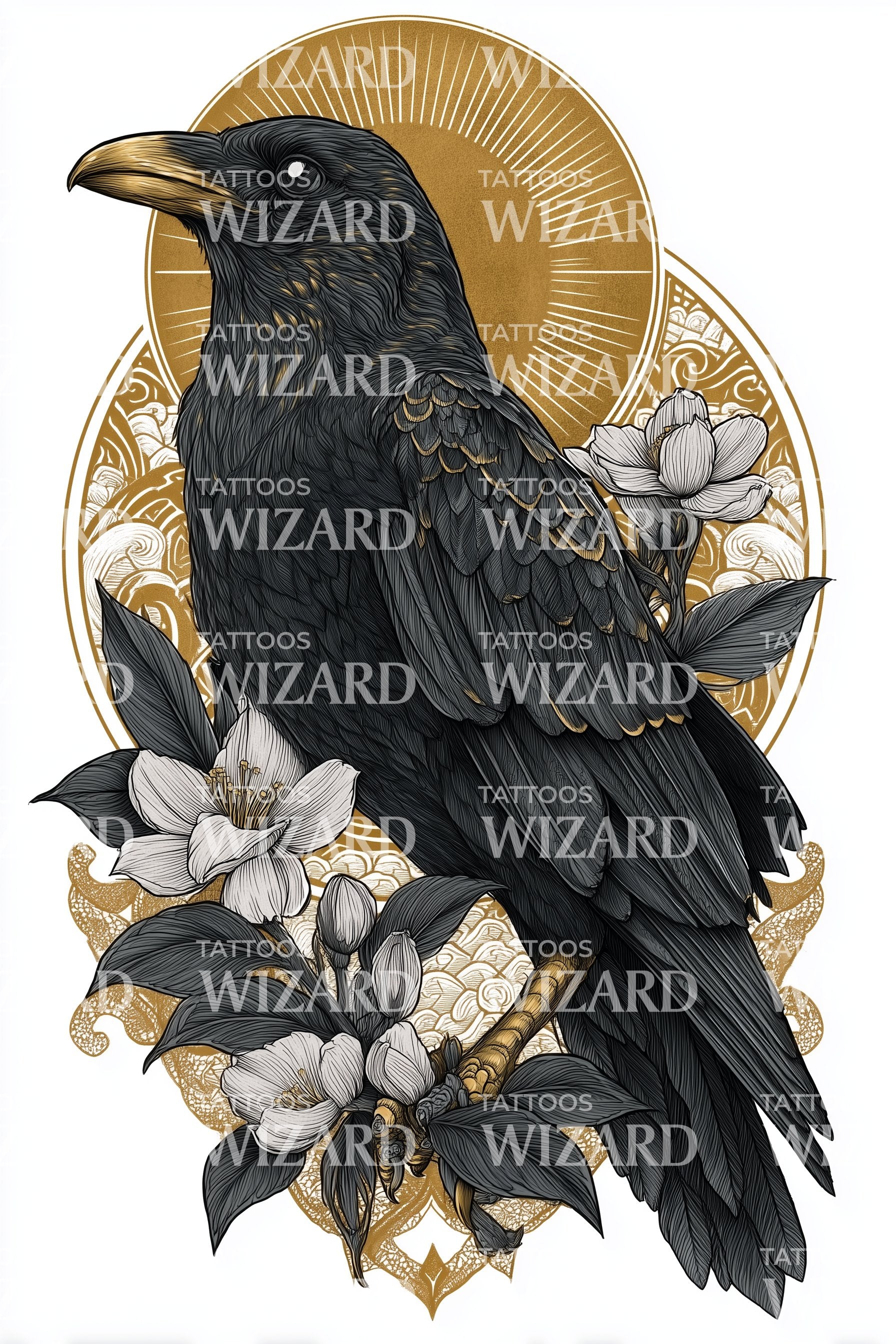 用我们精美的乌鸦与百合纹身设计展现你的精神气质。这幅充满写实风格的黑色墨水艺术作品,细致描绘了一只睿智的乌鸦栖息在柔美的百合花丛中。用这件象征性且富有灵性内涵的身体艺术,展现你的深度与内省本质。
