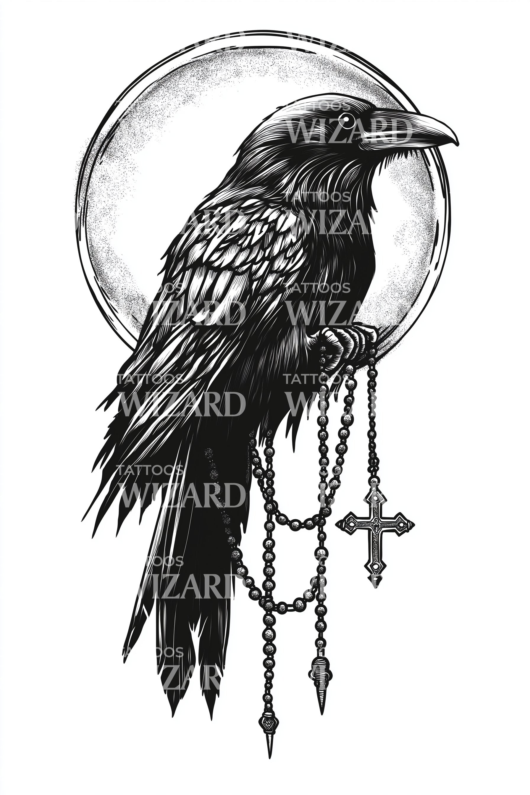 沉浸于夜晚的神秘之中,这款黑灰色纹身设计展现了一只威严的乌鸦,象征着渡鸦,唤起不屈的精神。月相与悬挂的念珠带来宁静,使这款设计成为对大自然奥秘与崇高神秘主义的隐秘致敬。