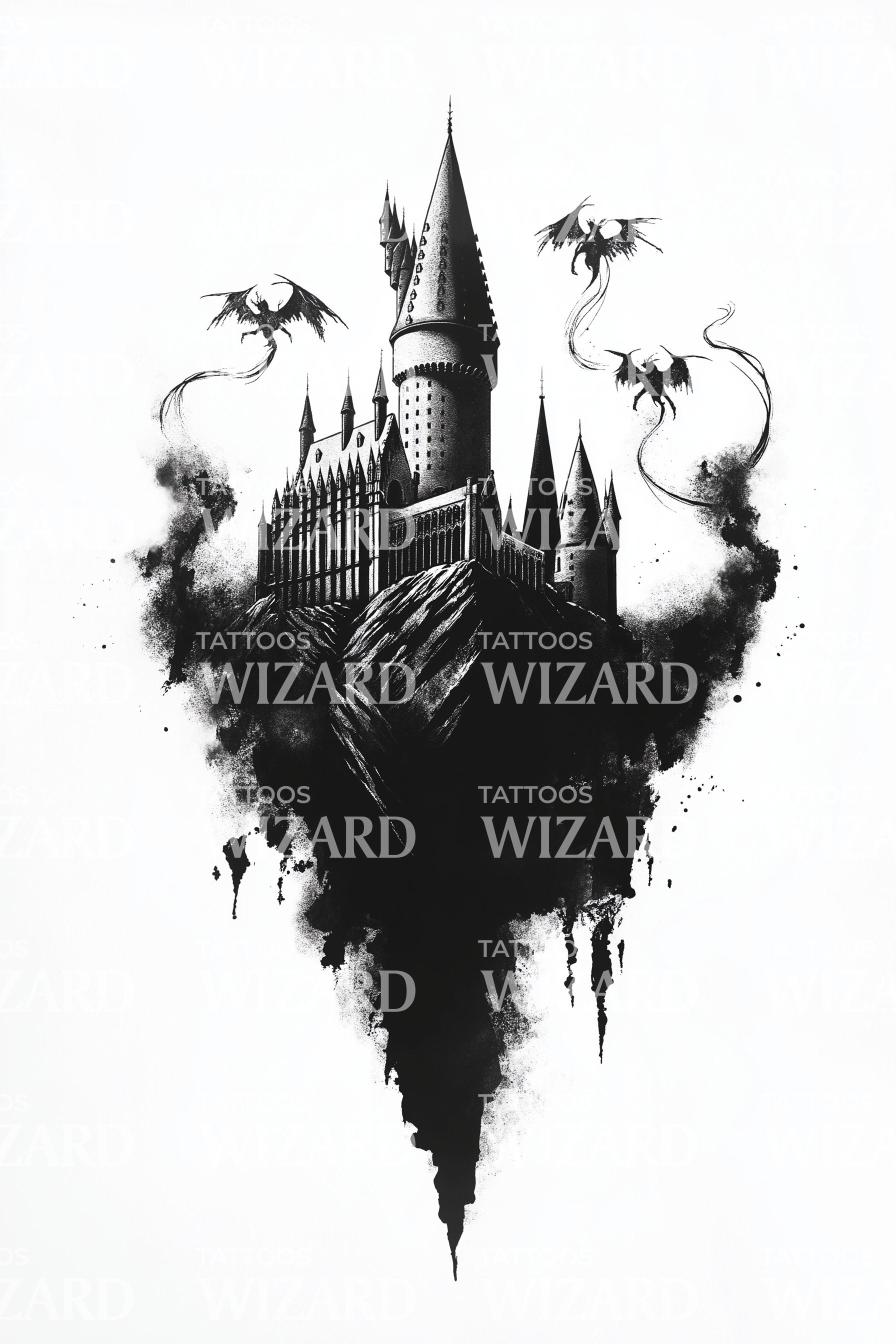 沉浸于神秘奇幻的世界,感受我们的黑色纹身设计。描绘一座黑暗神秘的城堡,尖塔高耸,其倒影若隐若现,这一设计将你带入超凡脱俗的宇宙。这不仅仅是一款纹身,更是你个人的、可穿戴的奇幻故事。