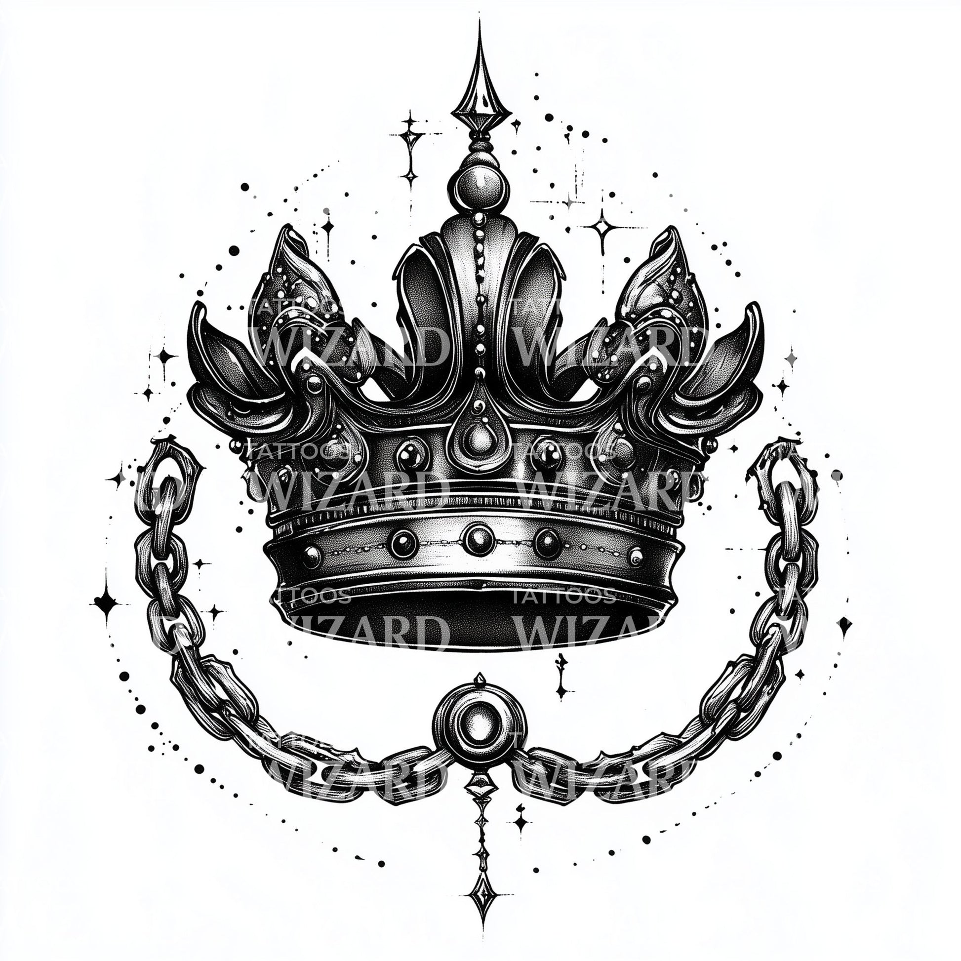 体验我们黑灰色纹身设计的皇家魅力。精心制作,包含一个华丽的王冠,缠绕在坚固的链条中;象征着皇家力量。视觉上引人注目,散发出一种永恒的魅力,体现了力量与优雅的迷人融合。将这个皇家徽章添加到您的收藏中。