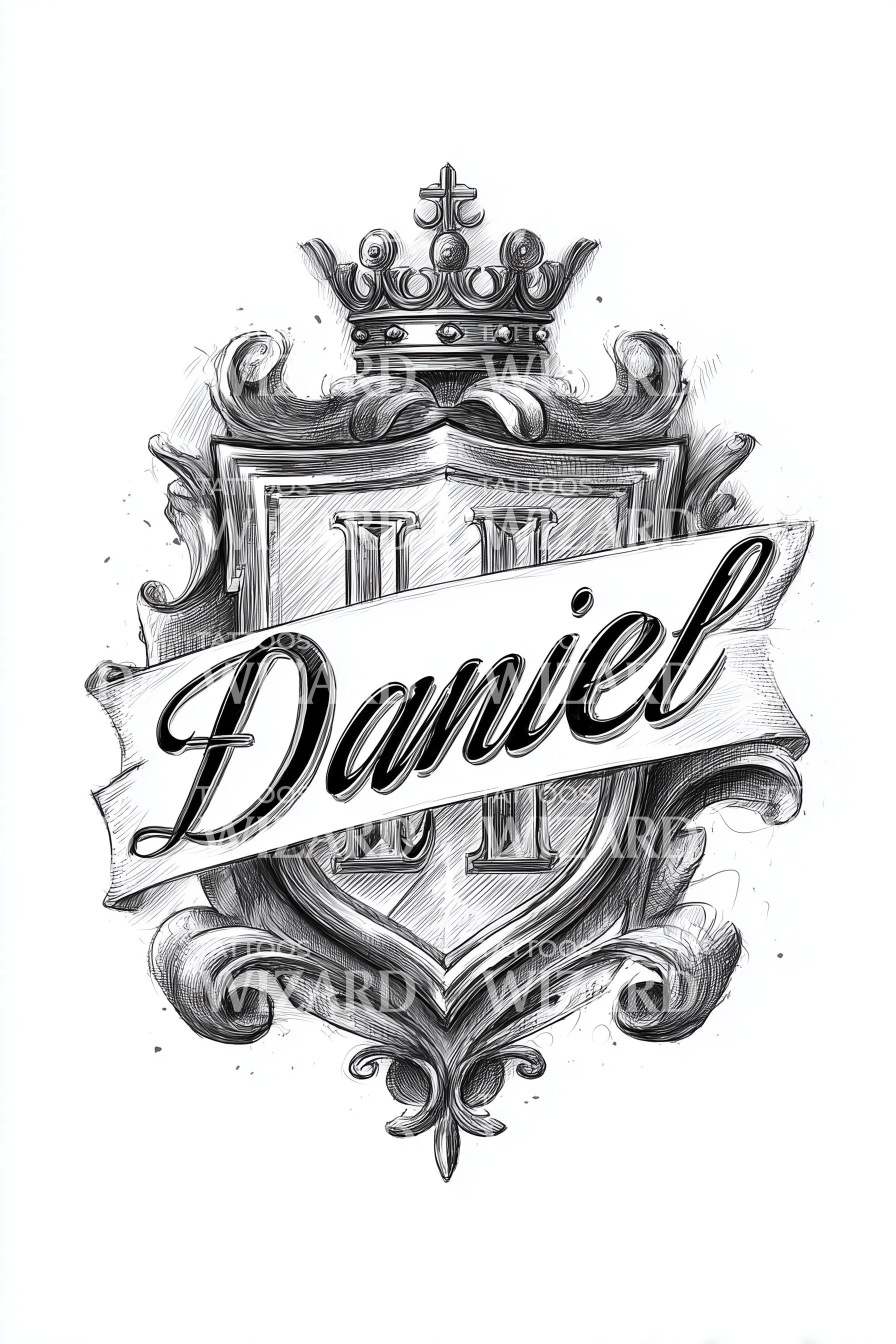 Regal scrollwork frames a bold shield and crowned crest, a banner carrying Daniel in sweeping script. The coronet signals inner sovereignty; the shield guards legacy; Roman numerals mark endurance. Wearing this mark feels noble and grounded, a personal standard of courage, loyalty, and quietly unstoppable purpose, everyday strength.