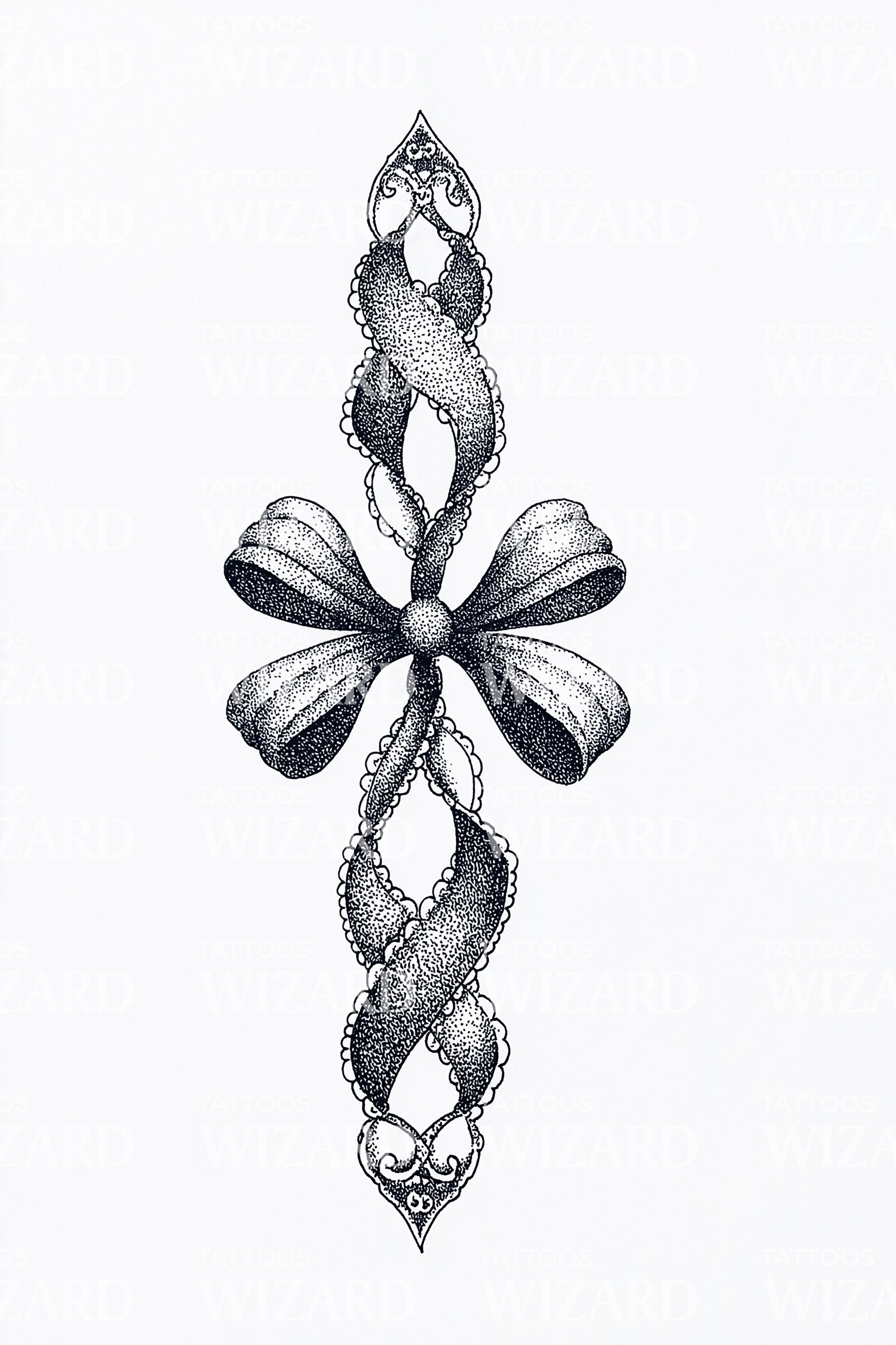 Ornamental ribbon-cross braided in lace-like dotwork, crowned with a soft bow at the heart. Twining strands form a delicate cross, joining devotion with tenderness. Symbolizes faith bound gently to life’s gifts, strength woven through grace. Worn close, it feels uplifting, serene, and exquisitely personal. Calm, hopeful radiance within.