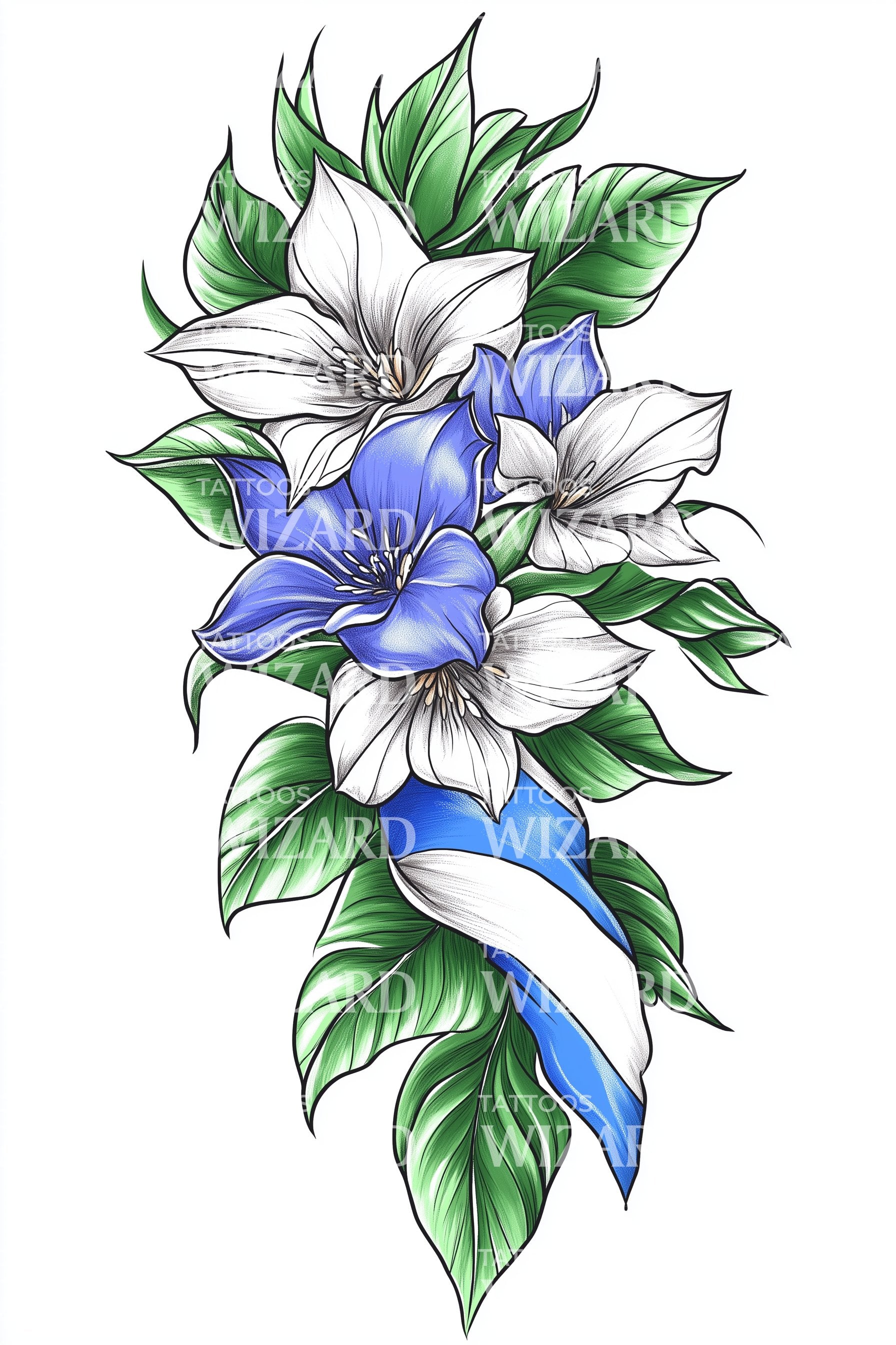 以优雅的植物纹身庆祝阿根廷精神:一束由本土花卉组成的精致花束,缠绕着天蓝色和纯白色的飘带。柔和的阴影和细腻的线条细节营造出动感与优雅,完美适合前臂或肩膀,致敬传统、自然与寓意深远的永恒花卉之美。