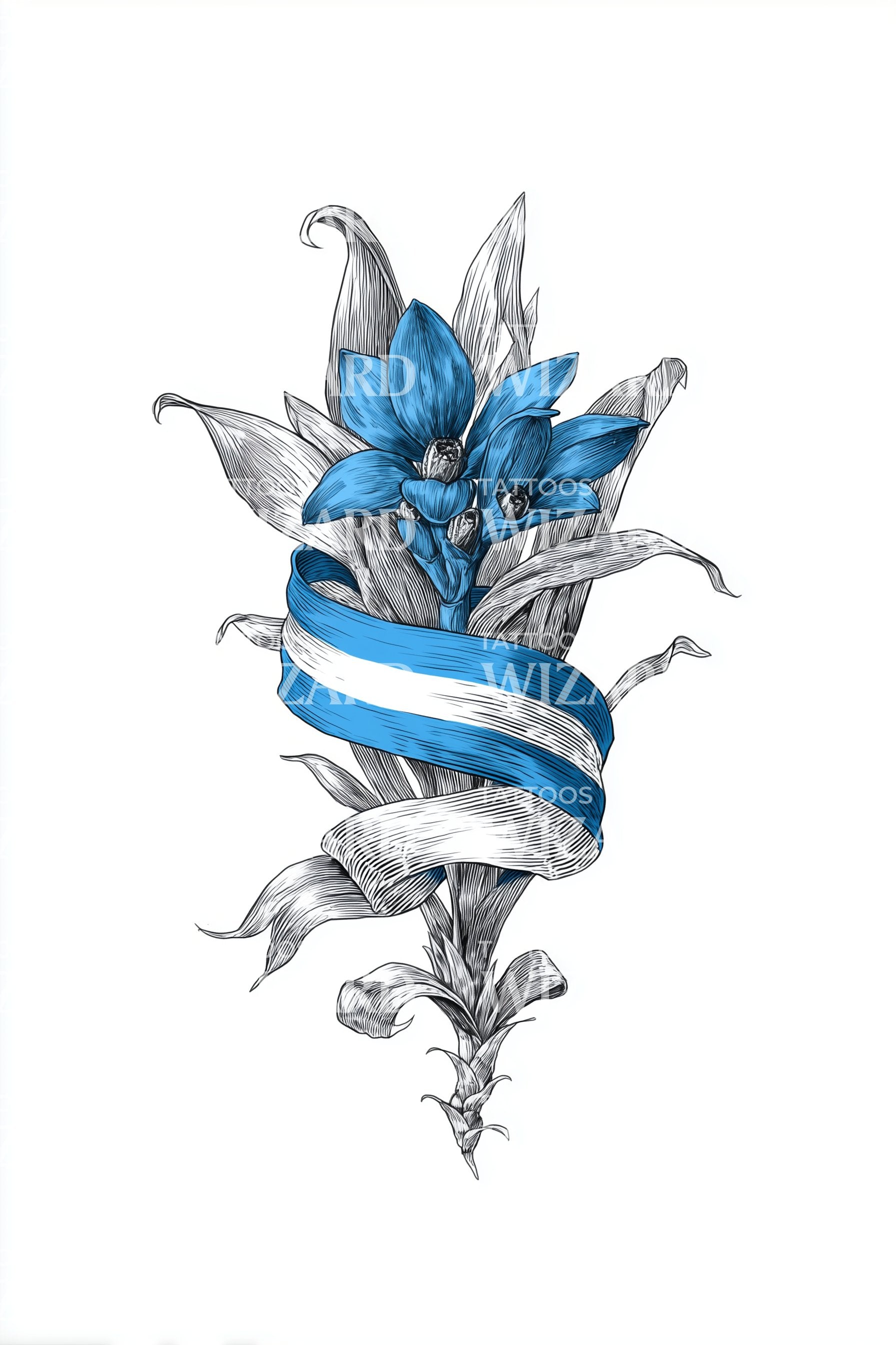 一个为海洋爱好者设计的插图徽章:一条缎面蓝色丝带环绕着一个螺旋形贝壳,周围是柔和的波浪和远处的岛屿地平线。清晰的线条和浓郁的蔚蓝色阴影营造出深度与动感,融合了怀旧与旅行的渴望,成为一个永恒的海岸护符,完美适合前臂、肩膀或脚踝。