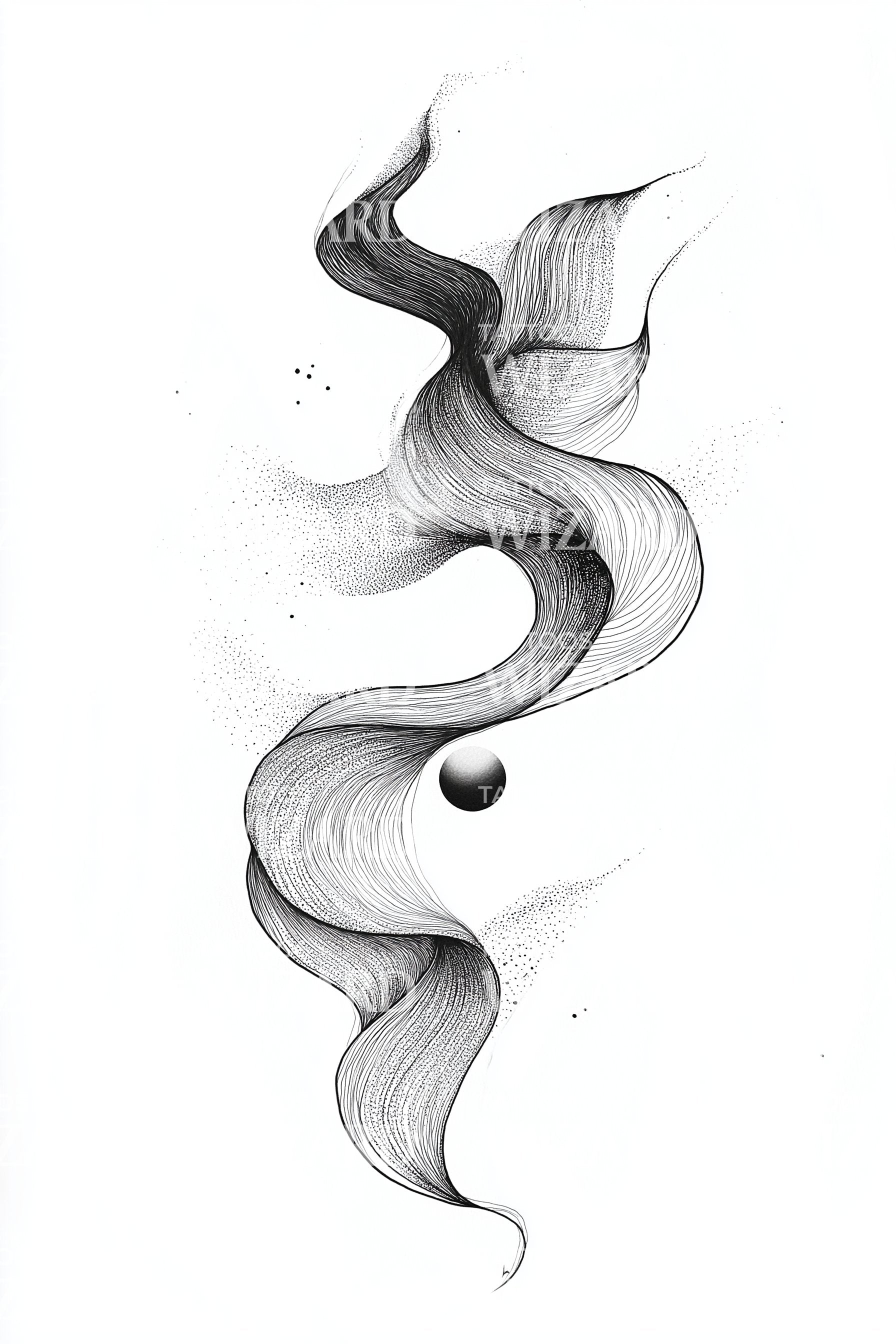 Velvet smoke unfurls in black&grey, a ribbon of fine lines and soft stipple orbiting a shaded sphere. The abstract flow suggests breath, transformation, and balance, like calm between inhale and exhale. Worn on skin, it feels weightless, graceful, quietly powerful, reminding movement itself is meaning in every moment.