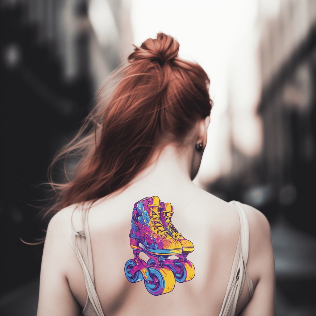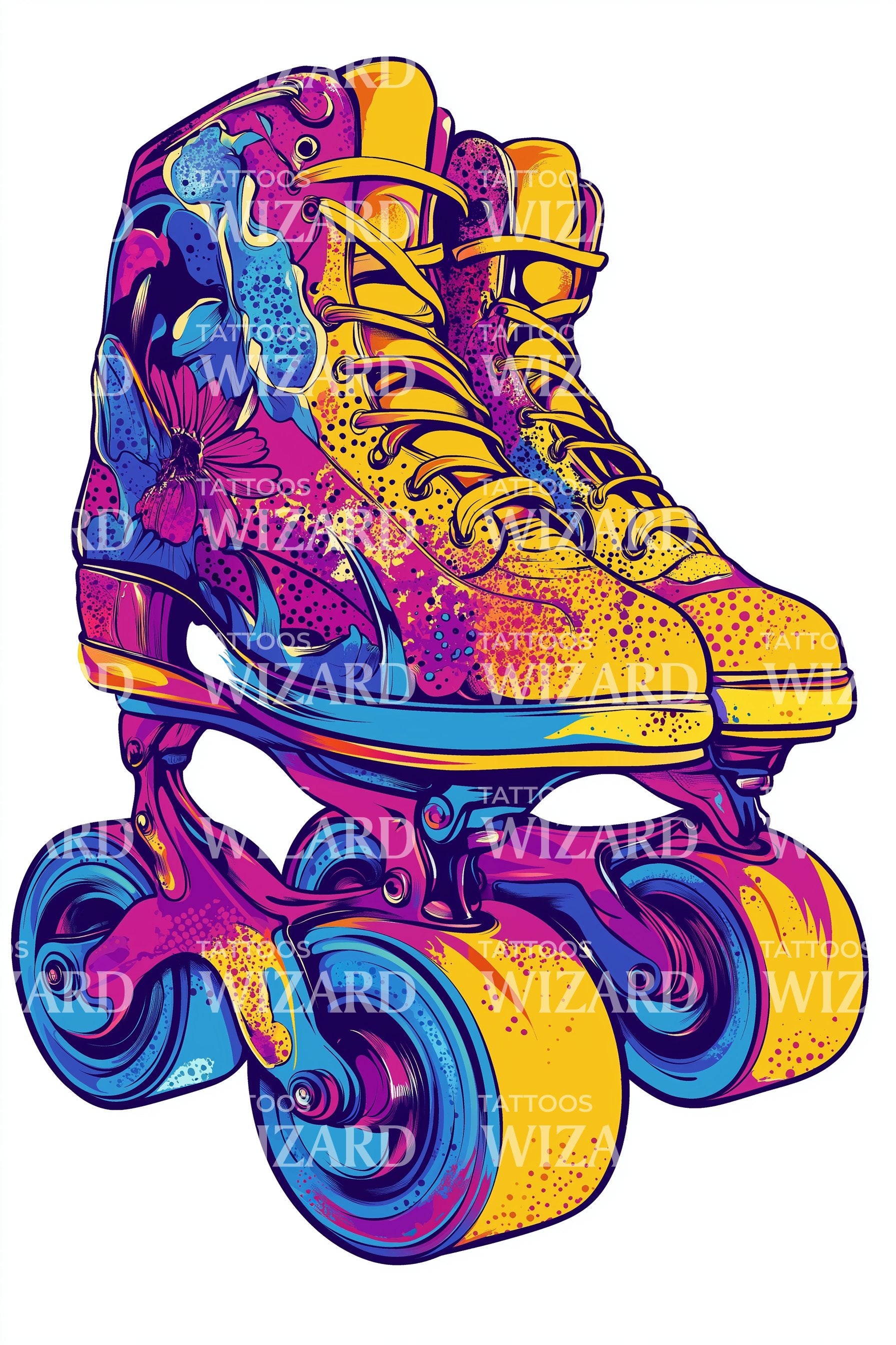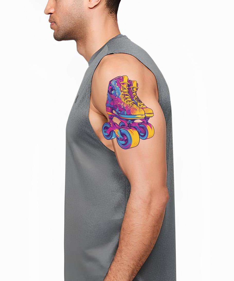 释放你前卫的精神,这款新潮纹身设计将复古霓虹色的魅力与滑板和轮滑主题融合,鲜艳而华丽,宛如一幅生动的挂毯。它完美平衡了充满趣味的老派风格的丰富色彩,打造出独特的美学效果。