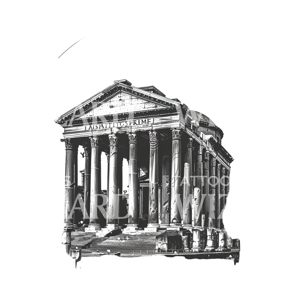 沉浸在古罗马的丰富壮丽中,这款令人惊叹的黑灰色纹身设计由纹身艺术家约翰精心制作,展现了罗马帝国遗迹和神庙的生动场景,让你每次凝视都仿佛置身于历史悠久的意大利心脏地带。
