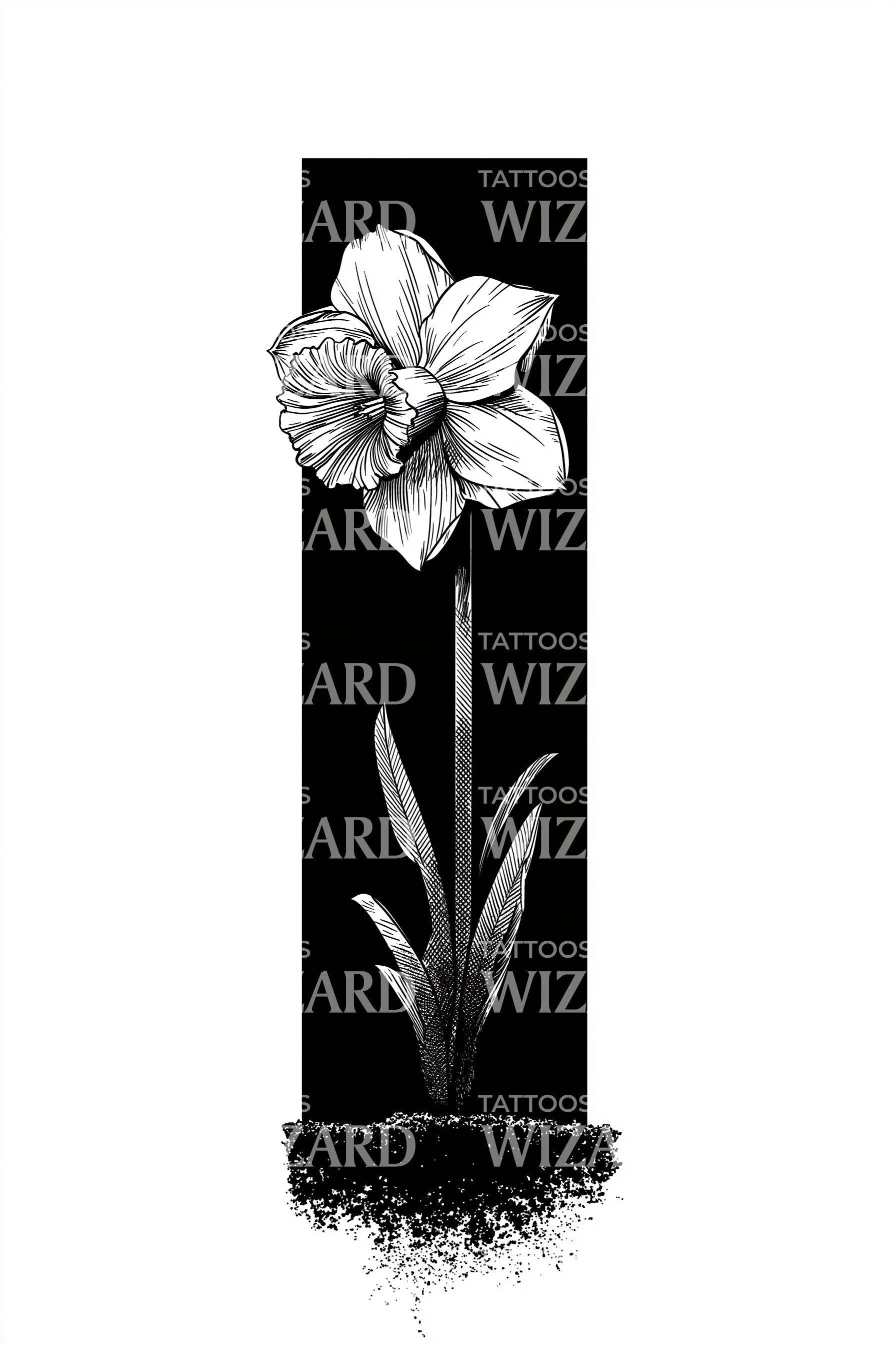 沉浸于大自然的美丽之中,这款黑灰纹身设计根植于艺术卓越。画面描绘了一朵水仙花,象征重生与新开始。其精细的黑灰细节增添了戏剧性的对比,突显花朵迷人的魅力。非常适合喜爱质朴花卉美学的你。