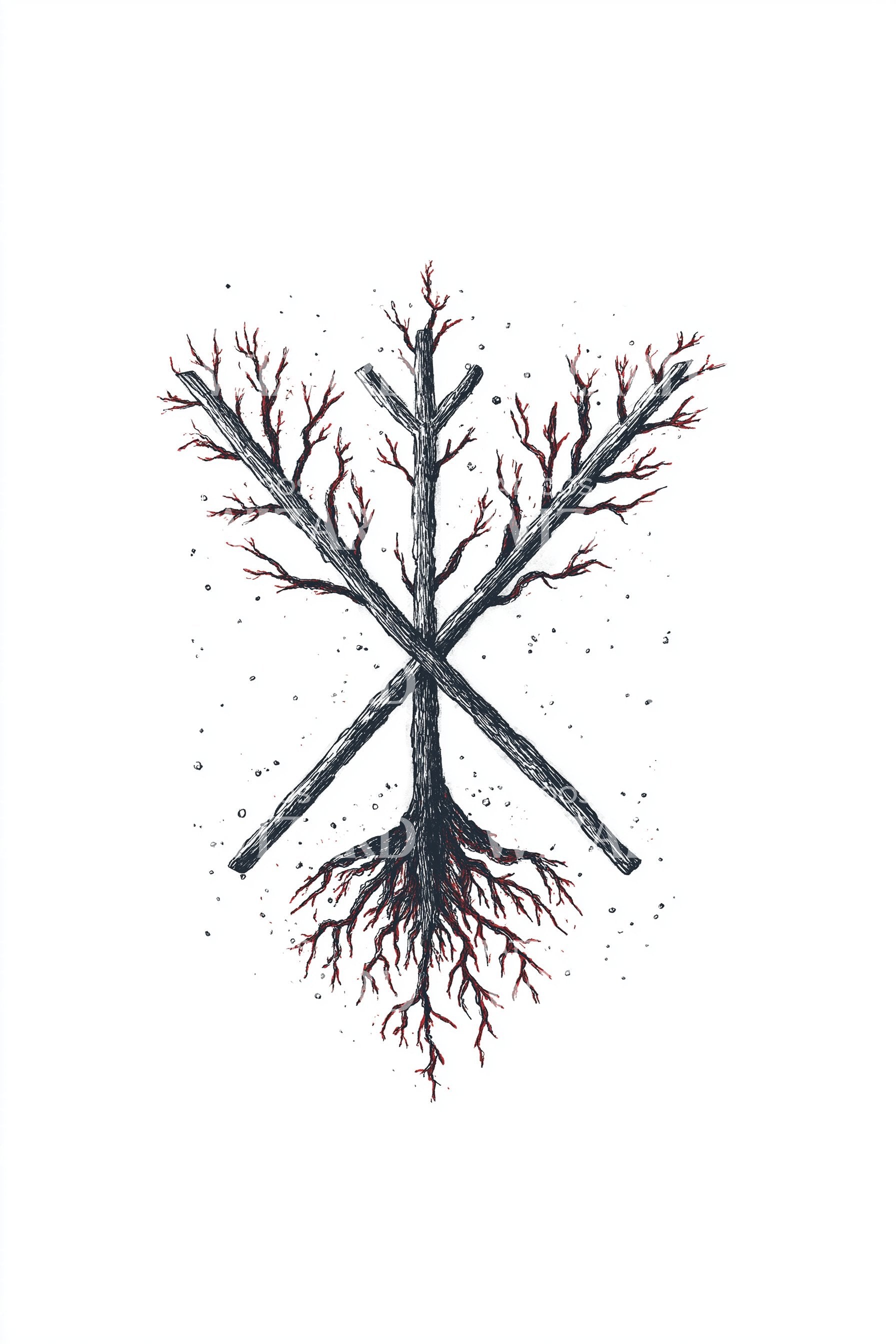 水彩双色调的树木以墨色枝干和炭红色根系升起,点缀着柔和的飞溅。交叉的枝条形成一个宁静的X,象征着成长、扎根与平衡的结合。经过磨砺,它感觉既稳重又充满生命力,深刻呼应内心的自然。非常适合纹在前臂、脊柱、小腿或胸骨处,垂直的流动与根系自然地扎根于此。