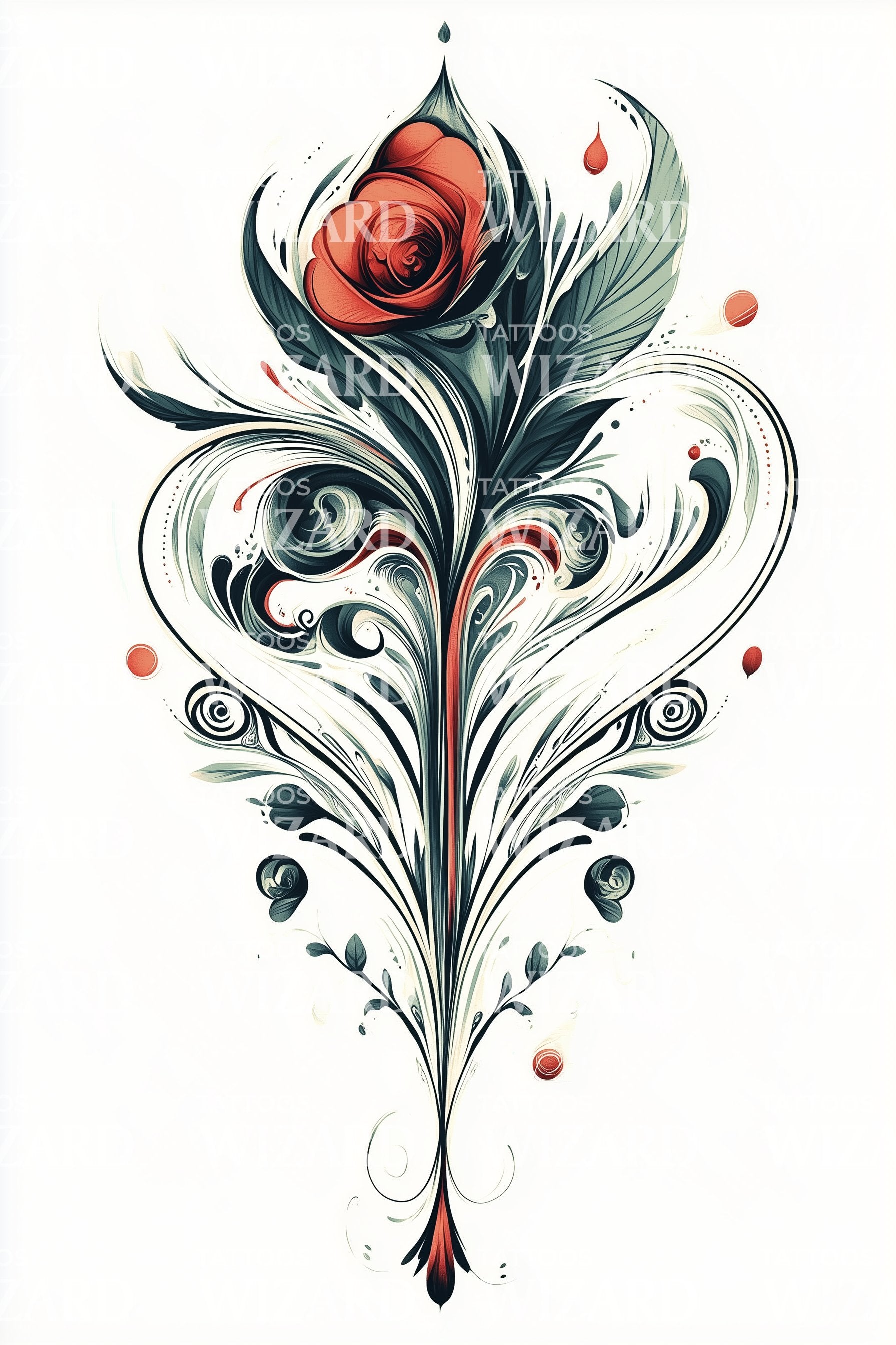 沉浸在神秘的优雅中,尽享我们的装饰性纹身设计。将细致的艺术与崇高的玫瑰相结合,花卉装饰提升了其视觉魅力。这个设计体现了一种宁静的花卉叙事,散发出一种装饰性的魅力,必将吸引追求风格与神秘感的纹身爱好者。