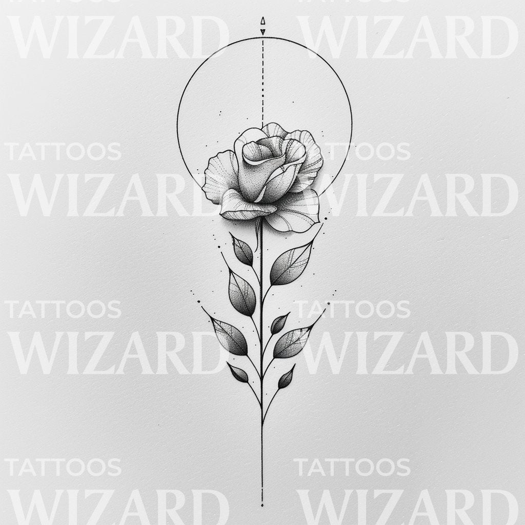 体验自然与几何的融合,尽在我们优雅的玫瑰几何纹身设计中。它展现了一朵丰盈的黑灰玫瑰,巧妙地与雄心勃勃的几何线条相连。这个设计作为力量、美丽和韧性的深刻象征,为你的肌肤增添了优雅的强调。