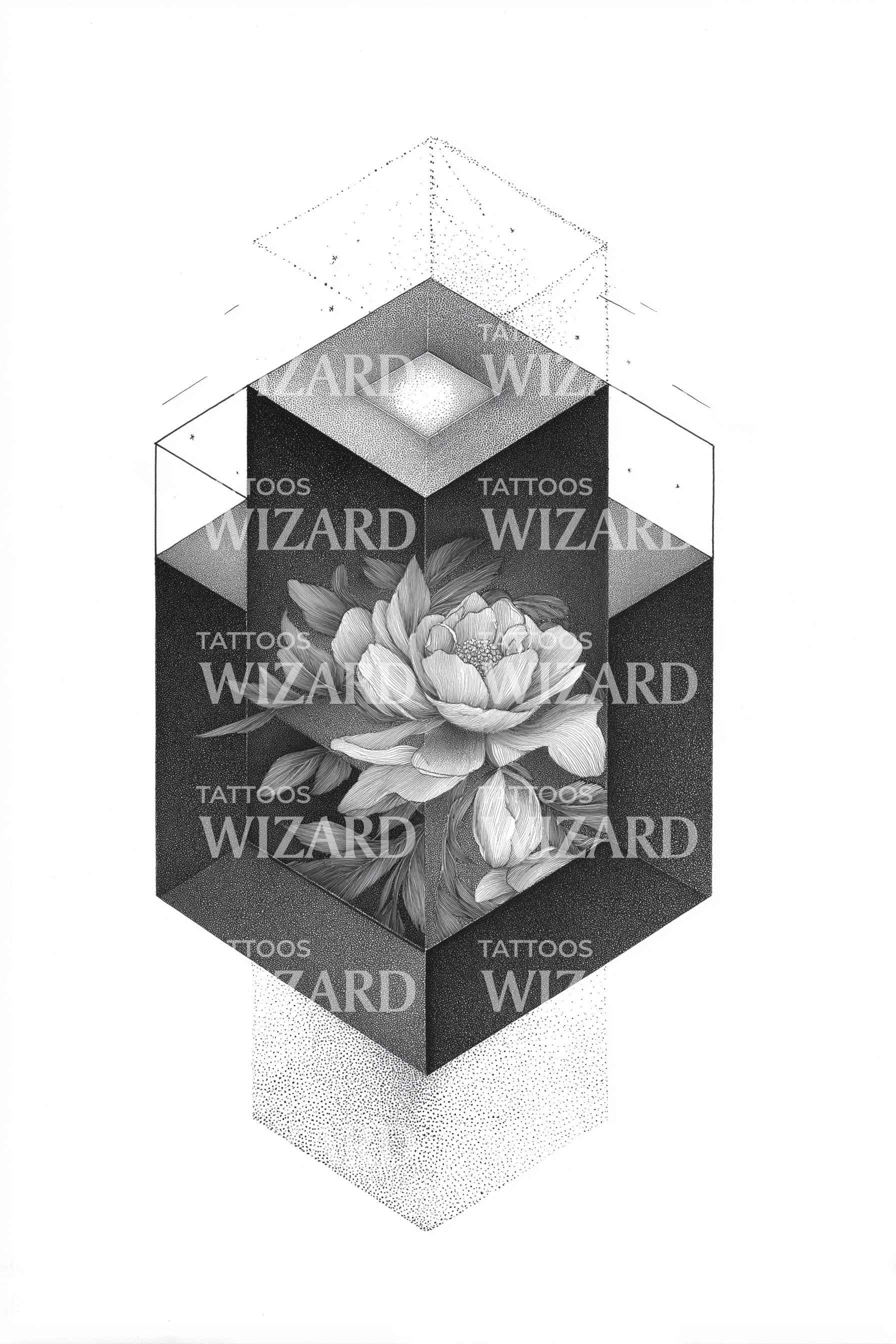 沉浸于自然与几何的独特融合,这款现代黑灰纹身设计完美地将一朵细致入微的玫瑰融入3D六边形和立方体中。强烈的对比展现出现代感,轻松将任何肌肤变成迷人的艺术作品。