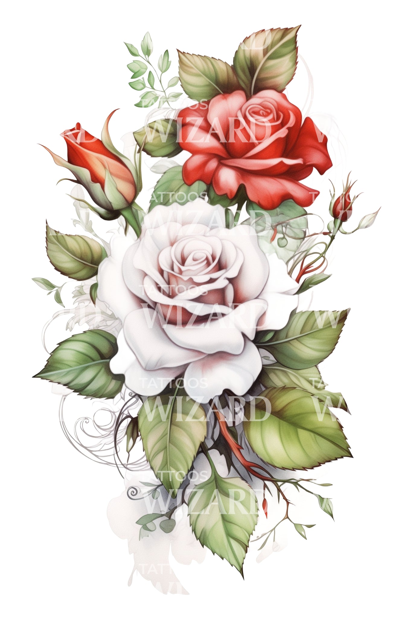用传统的纹身设计装饰你的肌肤,结合了玫瑰的永恒优雅与细腻的花瓣和叶子。这件引人入胜的作品还展现了交织的心形和复杂的纽扣细节,捕捉了自然的美丽,带有迷人的古典风格,真是一件令人惊叹的花卉杰作。