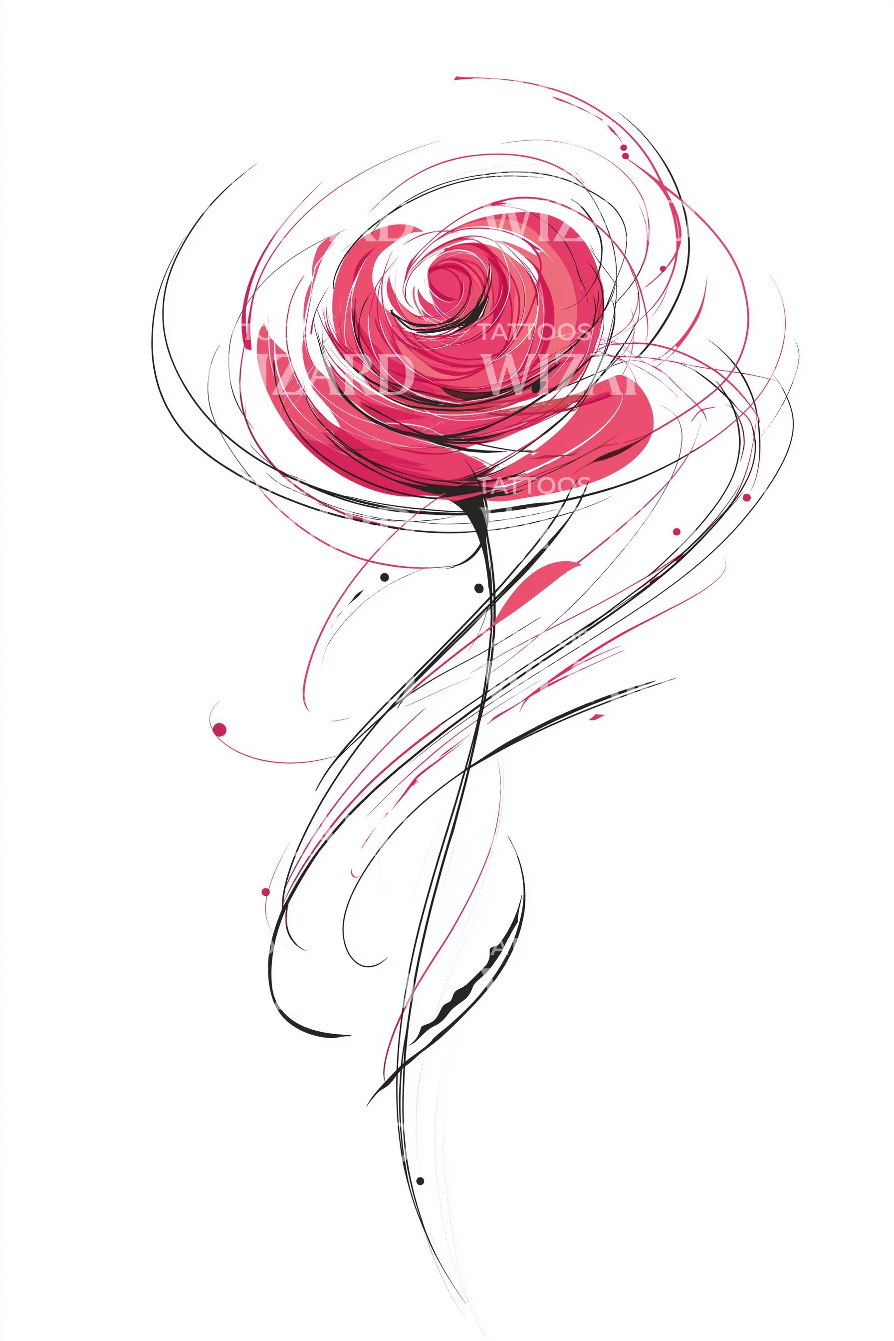 Scarlet watercolor rose spirals from fine black strokes, petals breathing in soft splashes and airy arcs. Symbol of romance and resilient growth, honoring love that blooms through motion. Wearing it feels elegant and alive. Ideal placements: collarbone, forearm, ribcage, ankle; follow curves, frame the slender stem, let petals breathe.
