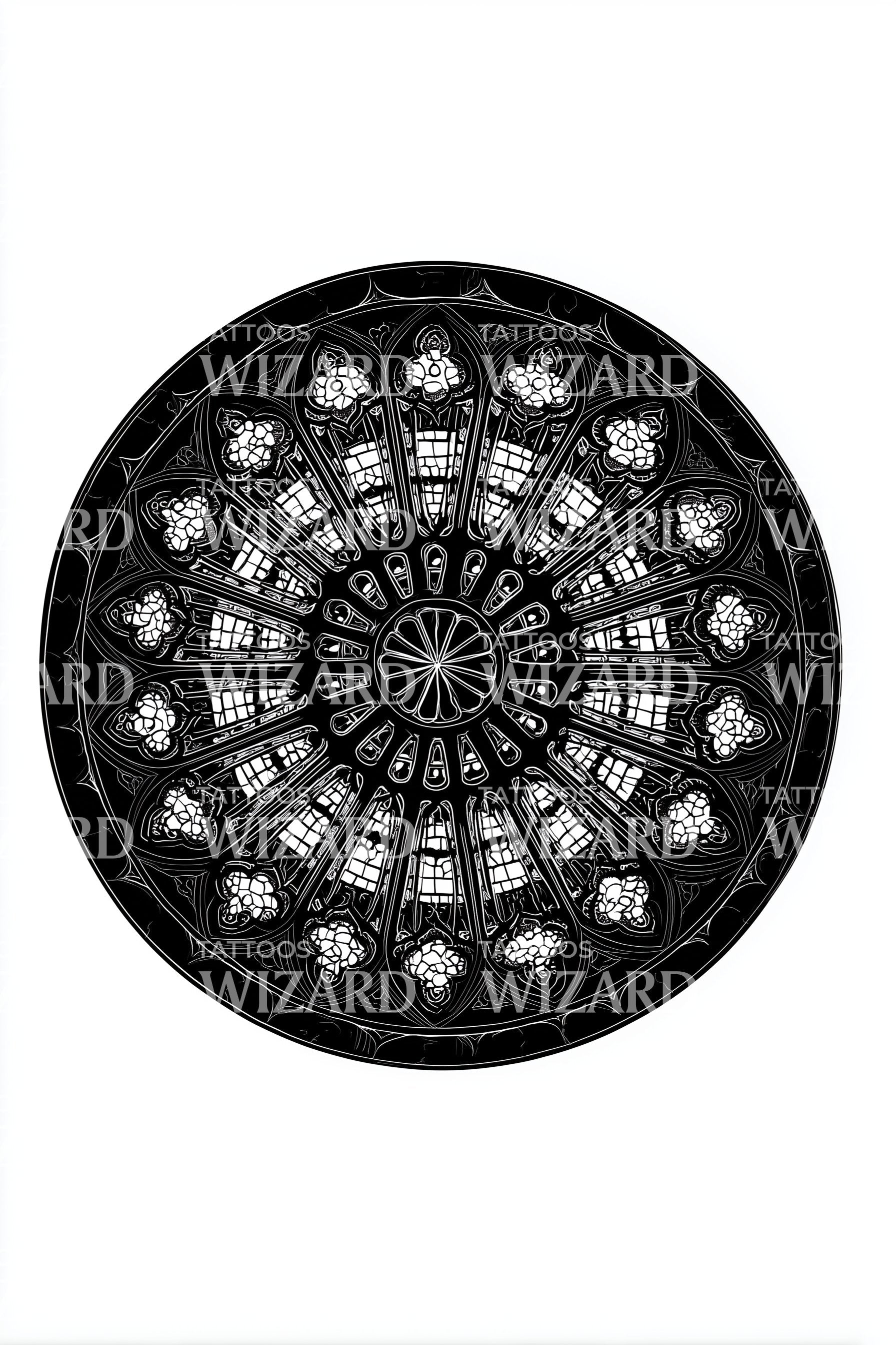 沉浸于这款迷人曼陀罗纹身设计的哥特魅力中。细致入微的细节展现了一朵玫瑰的优雅,包裹在曼陀罗华丽的藤蔓之中。其窗户般的美学唤起了永恒大教堂的宏伟气息,完美契合追求前卫而又精致身体艺术的你。