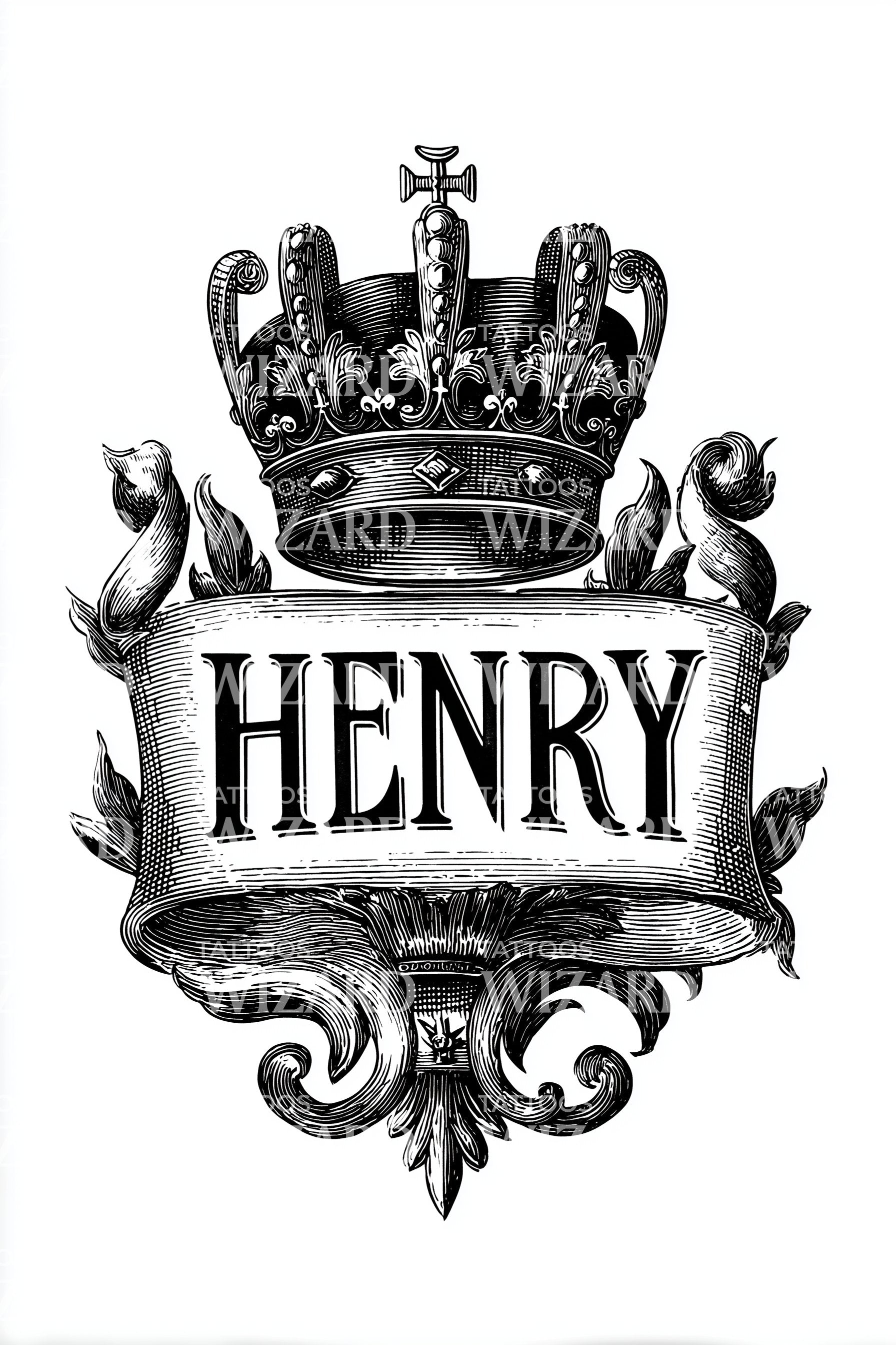 Regal black&grey linework forms a vintage crest: a jeweled crown above a scrolling banner bearing the name Henry, anchored by a stylized shield. The crown honors leadership, the shield protection, the scroll legacy. Wear it to feel steadfast, royal, and rooted in family pride, timeless strength and honor.