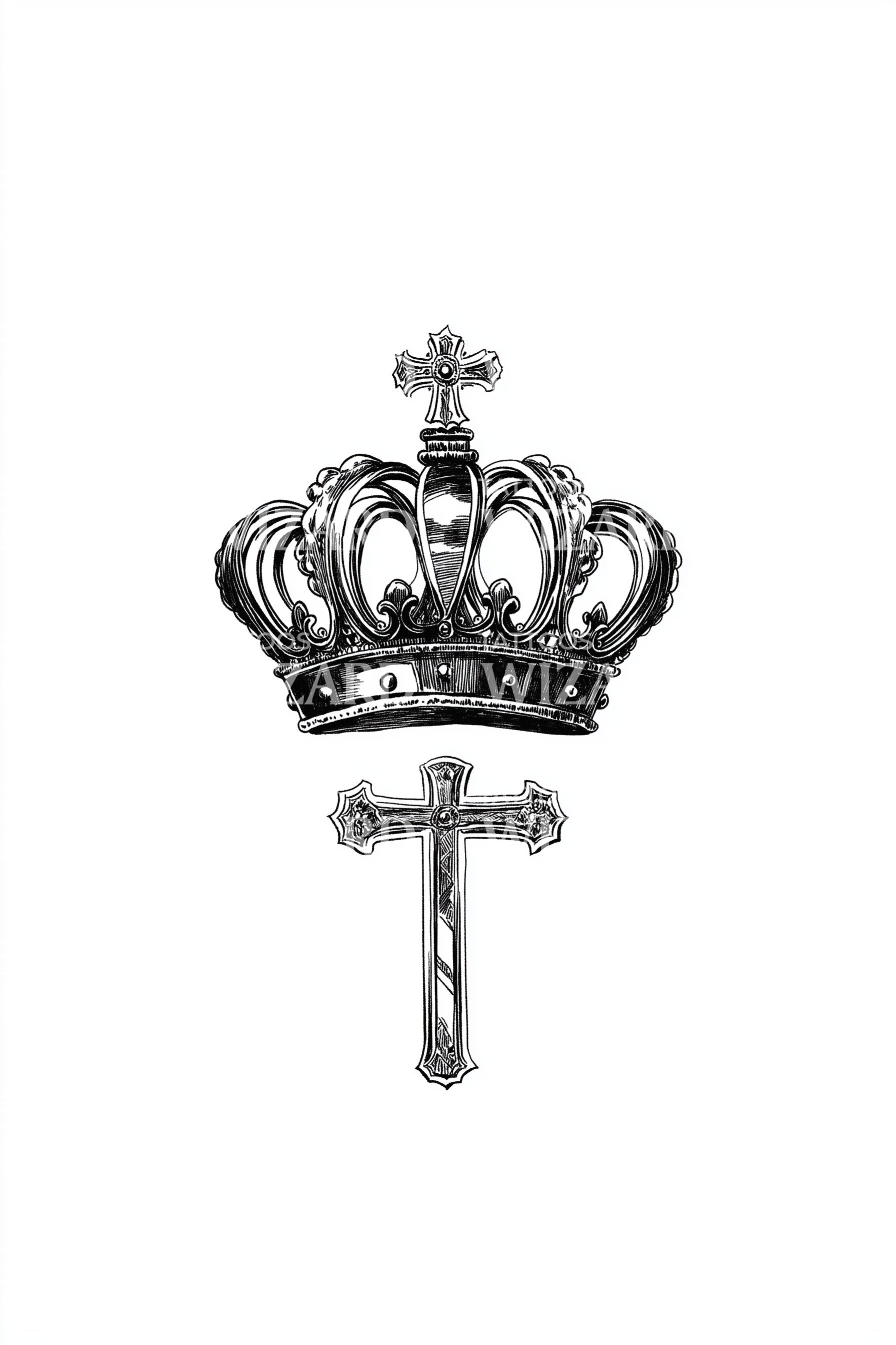 沉浸于这款黑色纹身设计的迷人魅力。饰以华丽的装饰,展现出一顶雄伟的皇家王冠与象征性的十字架交织。散发着信仰、力量与统治的气息,在深邃的黑暗与宏伟之间达成深刻的平衡。以墨迹美丽宣示着个人的信仰。