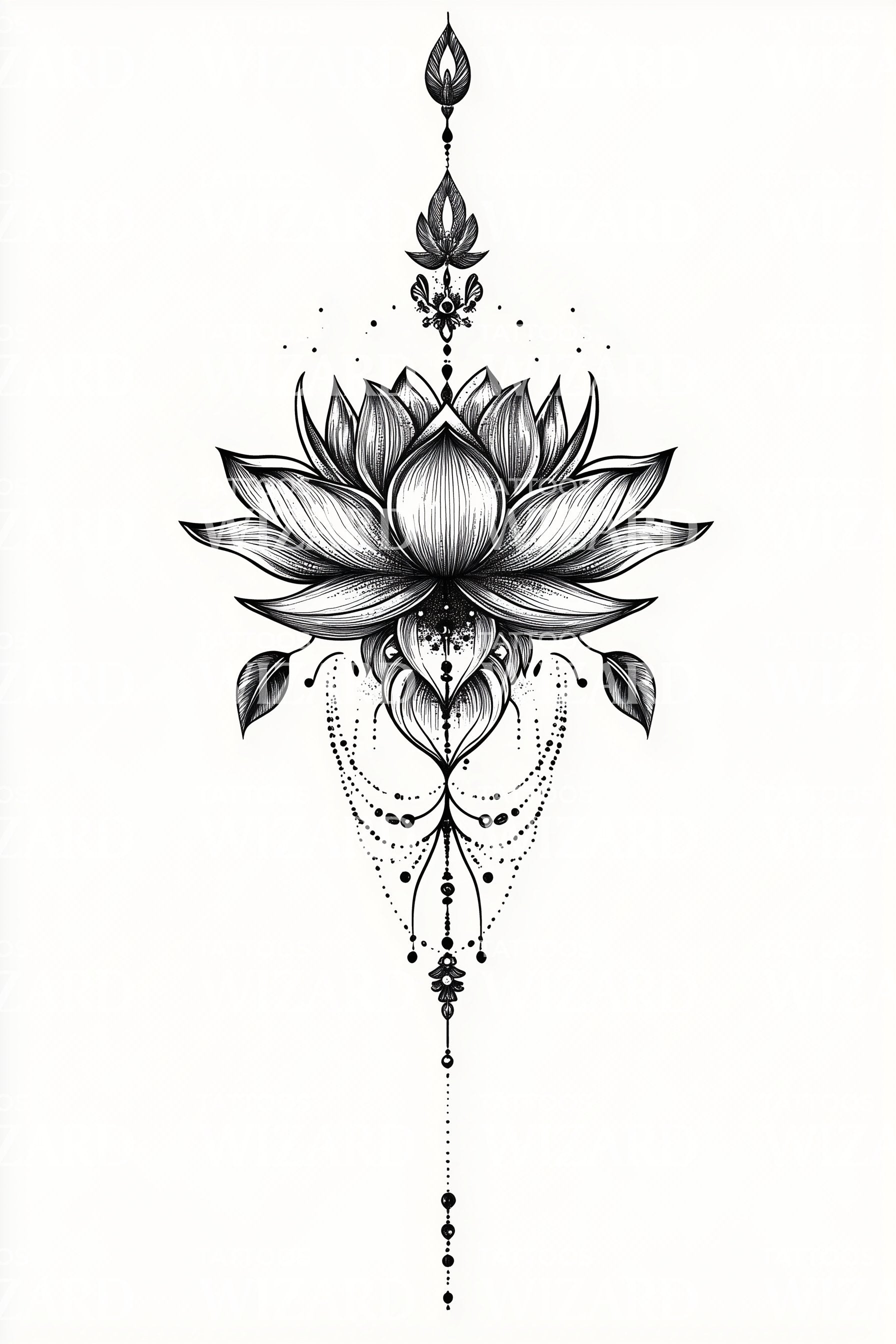 释放你内心的禅意,这款装饰性纹身设计以令人惊叹的吊坠图案为特色,融合了复杂的曼陀罗艺术,巧妙地融入了精美的珠饰细节。设计以宁静的莲花为终点,象征纯洁与觉悟。为你的身体艺术收藏增添一抹优雅与宁静。