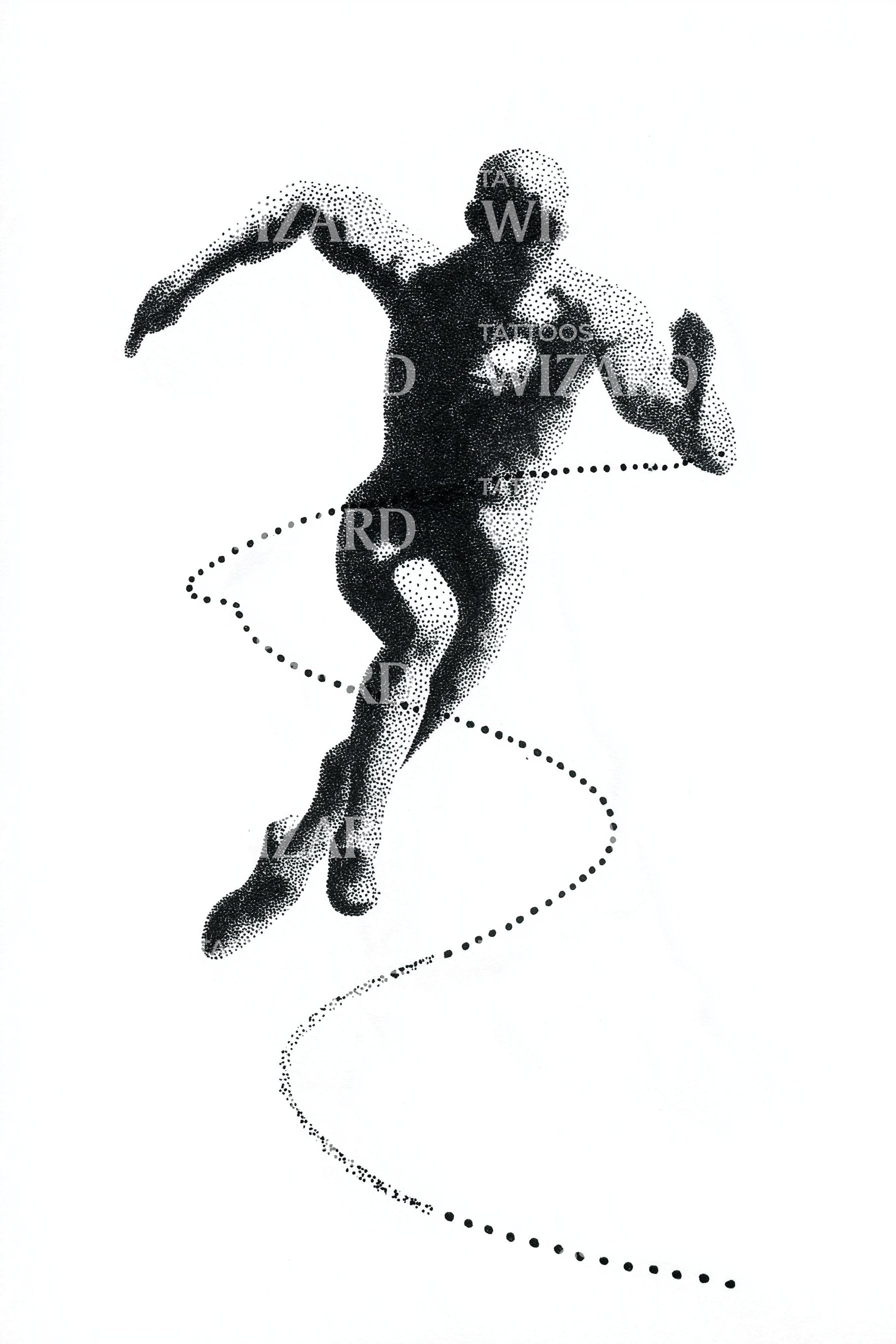 斑点轮廓向前冲刺,点状阴影雕刻肌肉,螺旋状的点阵轨迹描绘每一步。象征坚韧、耐力和曲折的进步之路。仿佛一股脉动的能量,驱动运动与活力。纹身位置:小腿象征动力;前臂象征流动;肋骨象征呼吸;脊柱象征道路。