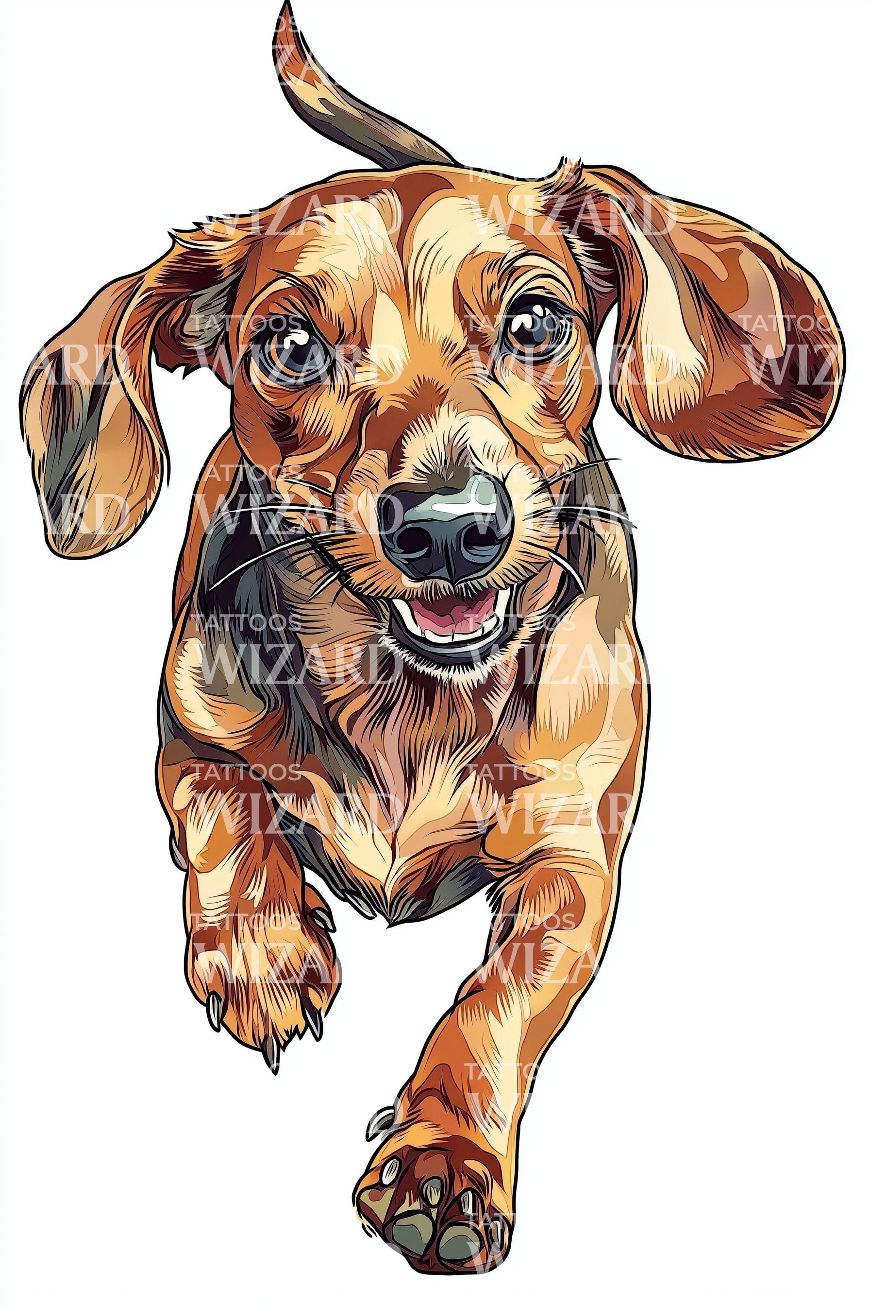 介绍我们充满活力的新派腊肠犬纹身设计!描绘了一只可爱、活泼的腊肠犬奔跑中的姿态,这件宠物灵感作品象征着忠诚的陪伴。用绚丽的色彩庆祝你对这活力四射品种的热爱。非常适合寻求兼具美学光彩与情感价值纹身的爱犬人士。