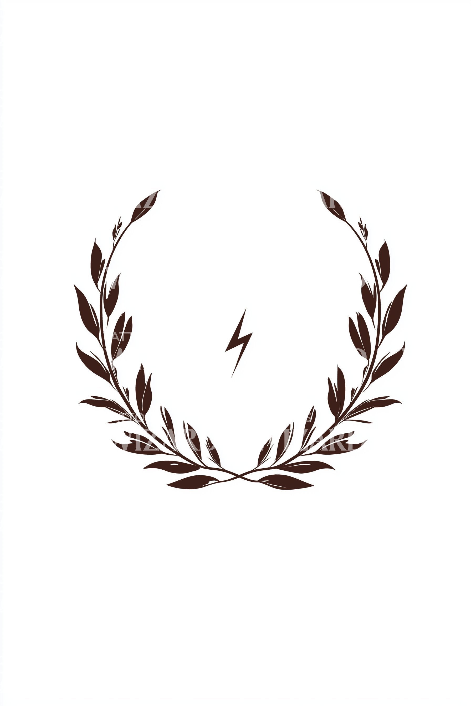 Blackwork laurel of olive leaves forms a rustic emblem, two branches crossing and cupping a keen lightning bolt. Laurel honors triumph; olive whispers peace and endurance; the bolt sparks change and courage. Worn on skin, it feels like calm strength: grounded, decisive, quietly victorious, ready for renewal.