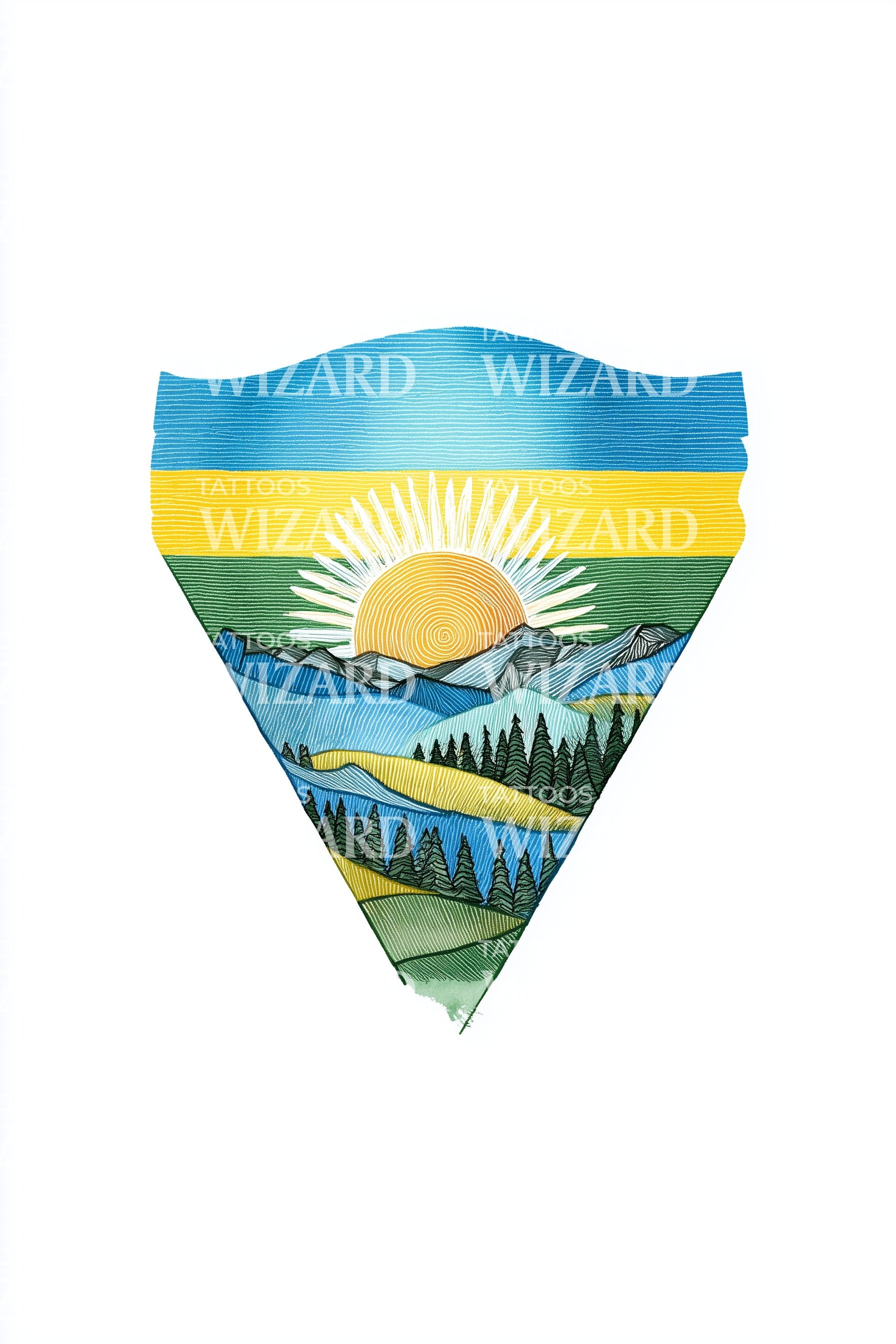 一款受卢旺达启发的插画风纹身设计:一个由起伏的山丘和灿烂的日出环绕的风格化盾牌。大胆的蓝色和鲜艳的黄色主导色彩,平衡了力量与乐观。细腻的线条纹理增添了深度,打造出一个永恒的风景徽章,庆祝坚韧、守护与新的开始。