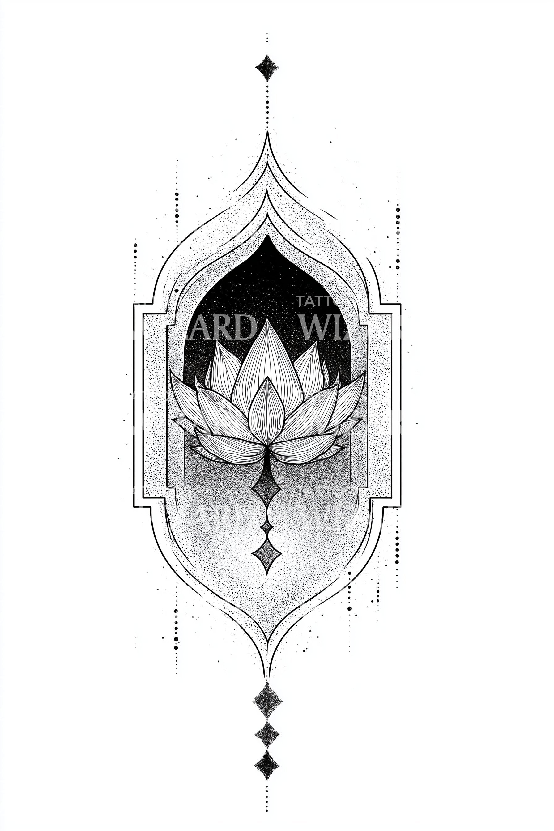 沉浸于这款装饰性纹身设计的神秘庄严之中。以神圣的莲花曼陀罗为中心,它散发出如圣殿般的氛围。精心雕琢的细节,这款惊艳的设计象征着精神觉醒与内在成长——为你独特的自我发现之旅而准备。