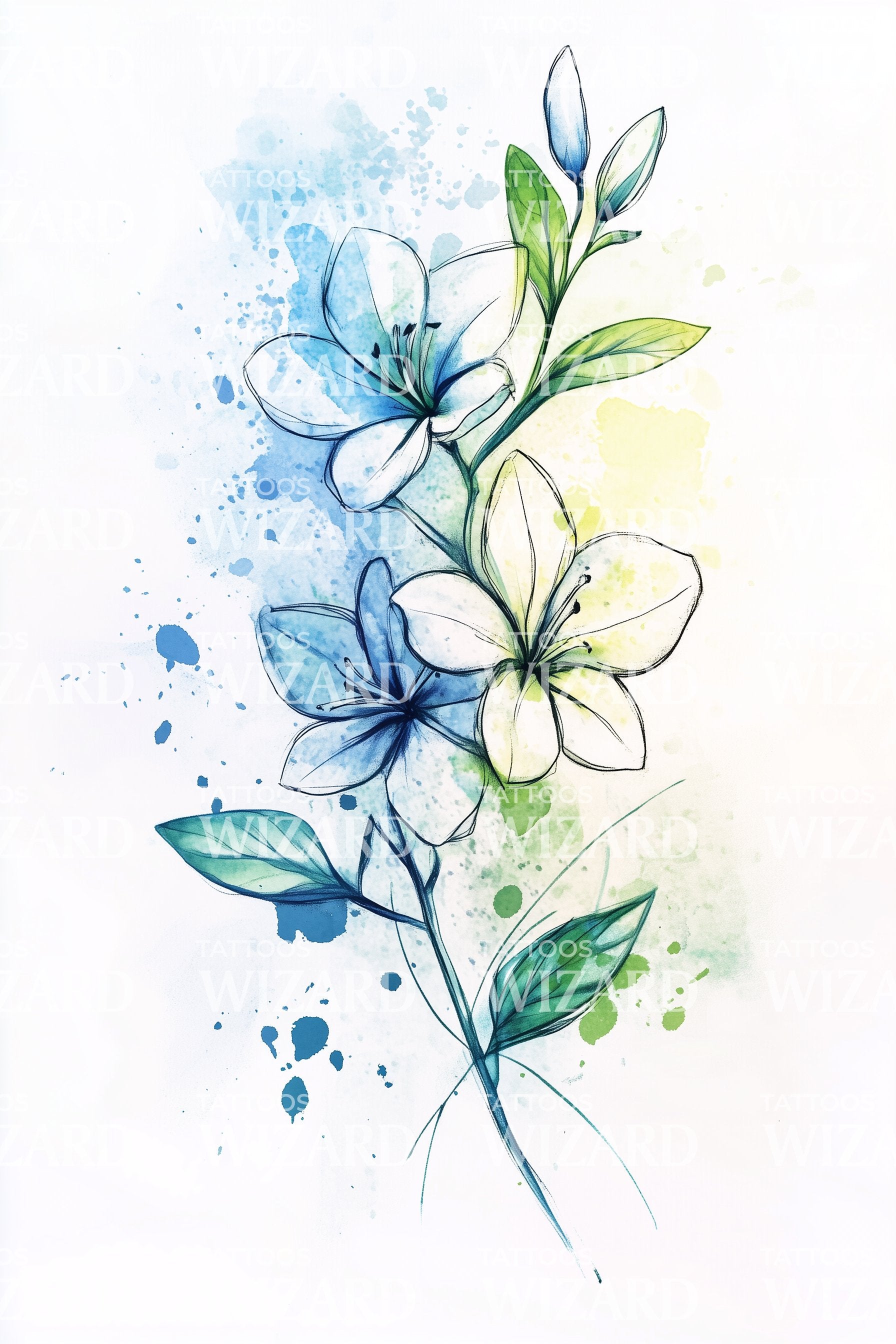 这款宁静的水彩纹身设计融合了水蓝色和青绿色调,优雅地交织成一条宁静的藤蔓。其独特的花卉点缀增添了美感,以惊艳的水彩艺术捕捉大自然的魅力。非常适合追求平和与宁静的您。